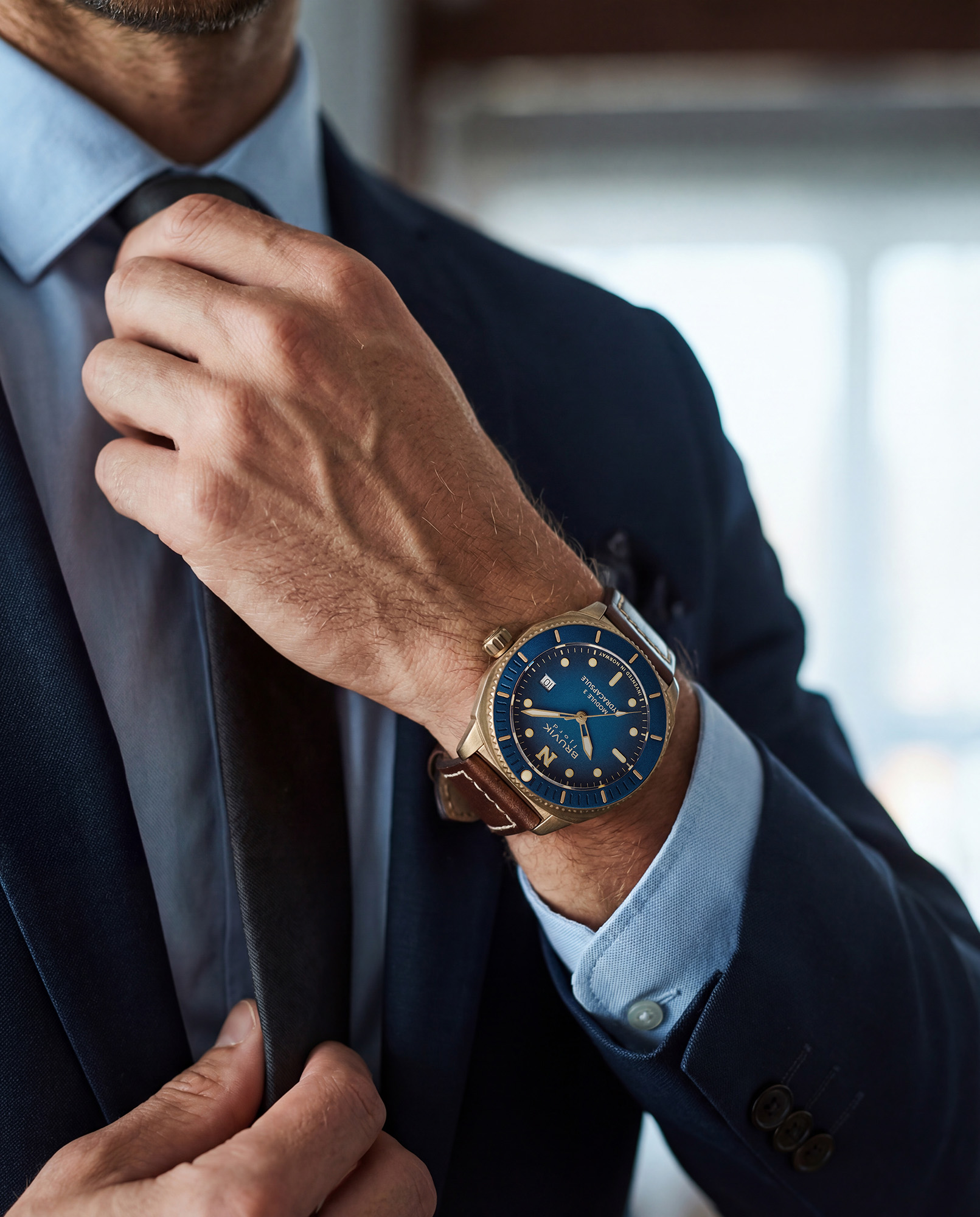 Avstanden til en tradisjonell dykkerklokke underbygges videre med designet på den dreibare bezelen i anodisert aluminum, som utover laserskjærte timemarkører også har diskré minuttmarkeringer på begge sider av perlen. En detalj Bruvik selv mener gir økt visuell harmoni og bedre balanse.