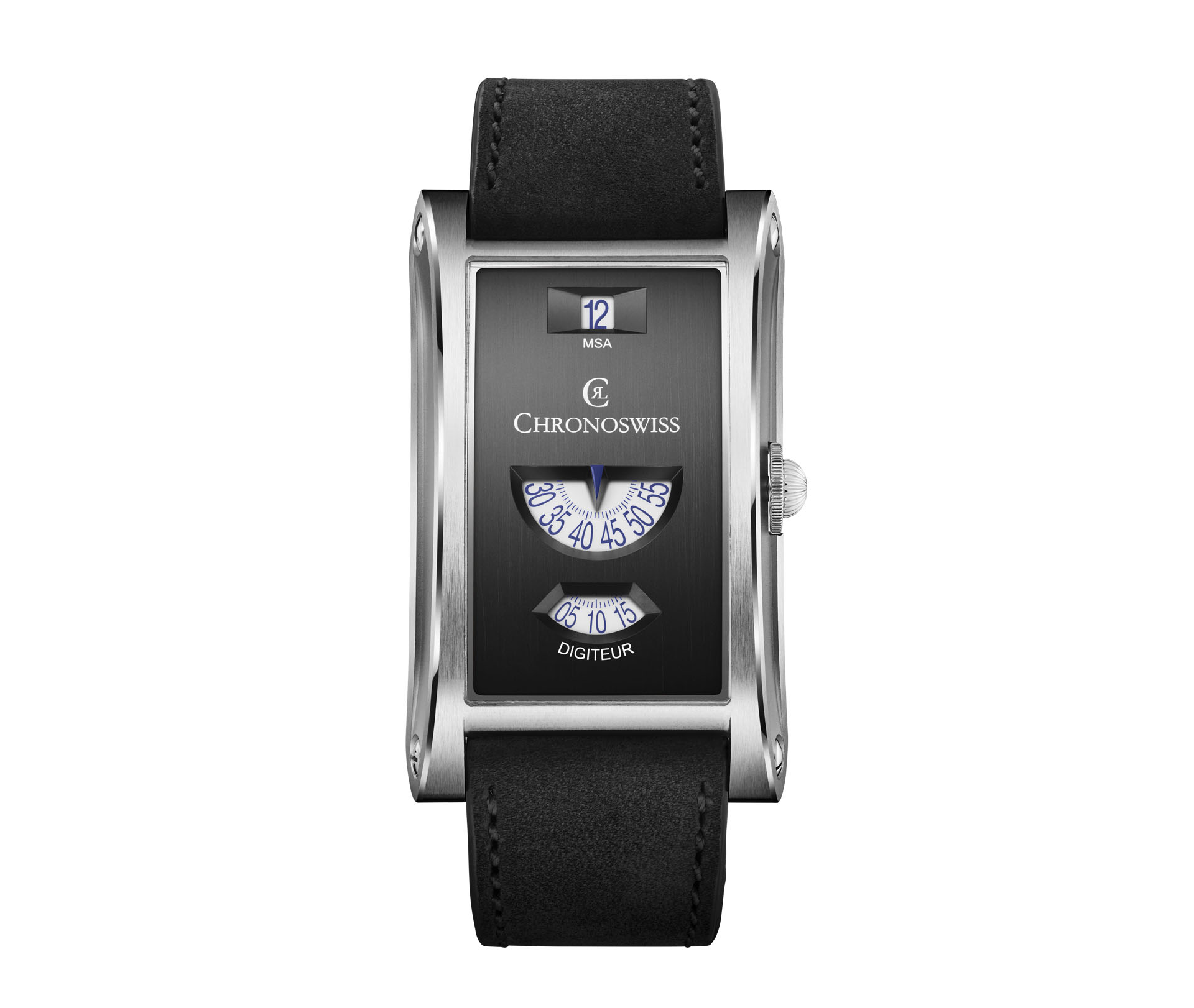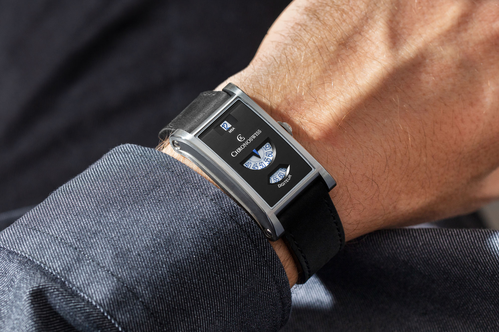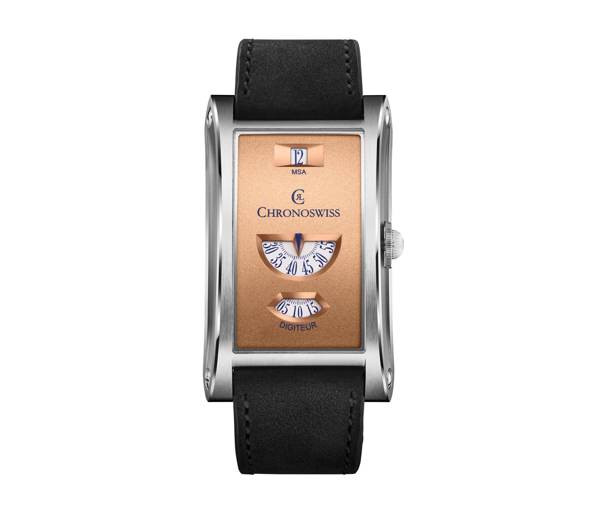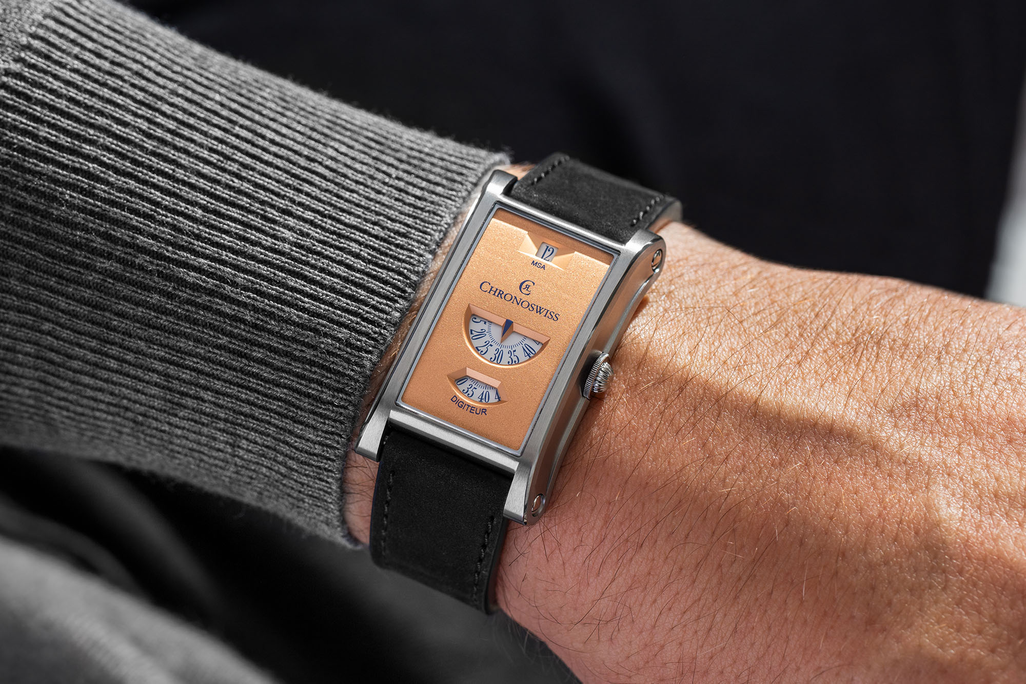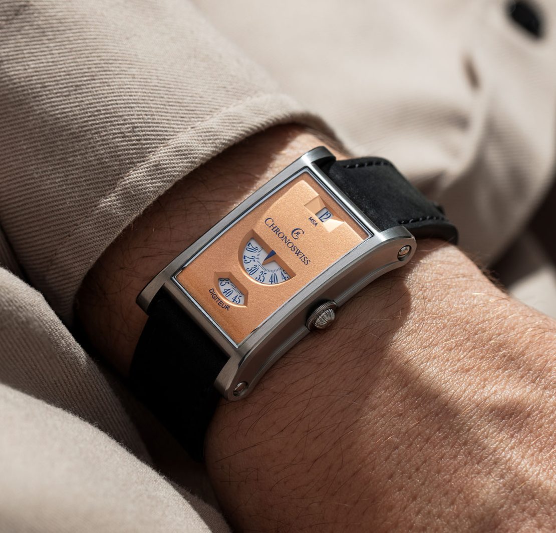 Til sammenligning føles Neo Digiteur langt mer moderne, med en åpenbar «neo-vintage» kulhetsfaktor. Kassen har en rektangulær og buet form, hvor ulik finish skaper dybde og kontraster. Kronen er inspirert av Chronoswiss’ velkjente løkformede krone, og bidrar til en ekstra dose særpreg.