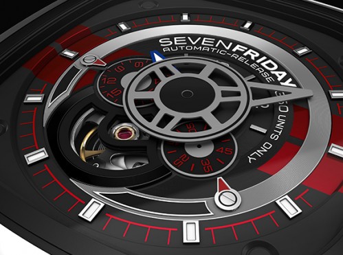 De polerte indeksene har denne gang blitt utstyrt med hvit SuperLuminova, noe det er første gang vi ser fra SevenFriday. Uret drives videre av det etterhvert kjente selvtrekkende mekaniske Miyota 82S7.