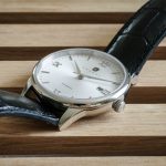 Den hvite urskiven har et sirkulært mønster, som definitivt tilfører uret en dose rafinnement. Ellers er det benyttet en kombinasjon av romerske numeraler og indekser, som kanskje er et lite nikk til et visst svært respektert Glashütte-basert manufaktur. Det samme gjelder for øvrig de sverdformede viserne, som vi heller ikke ser så altfor ofte på ur i denne prisklassen.