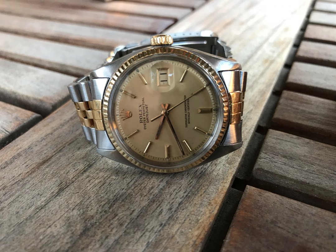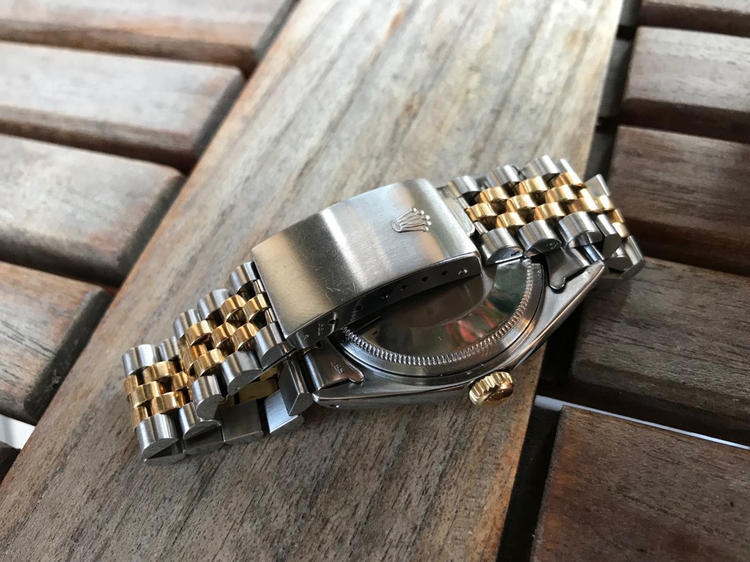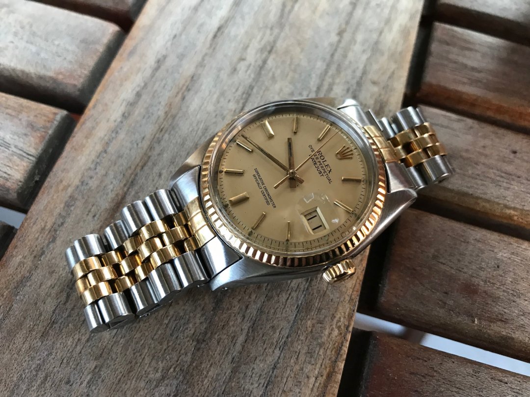 Merke, modell og år:Rolex Datejust referanse 1601 (gull/stål) 1980