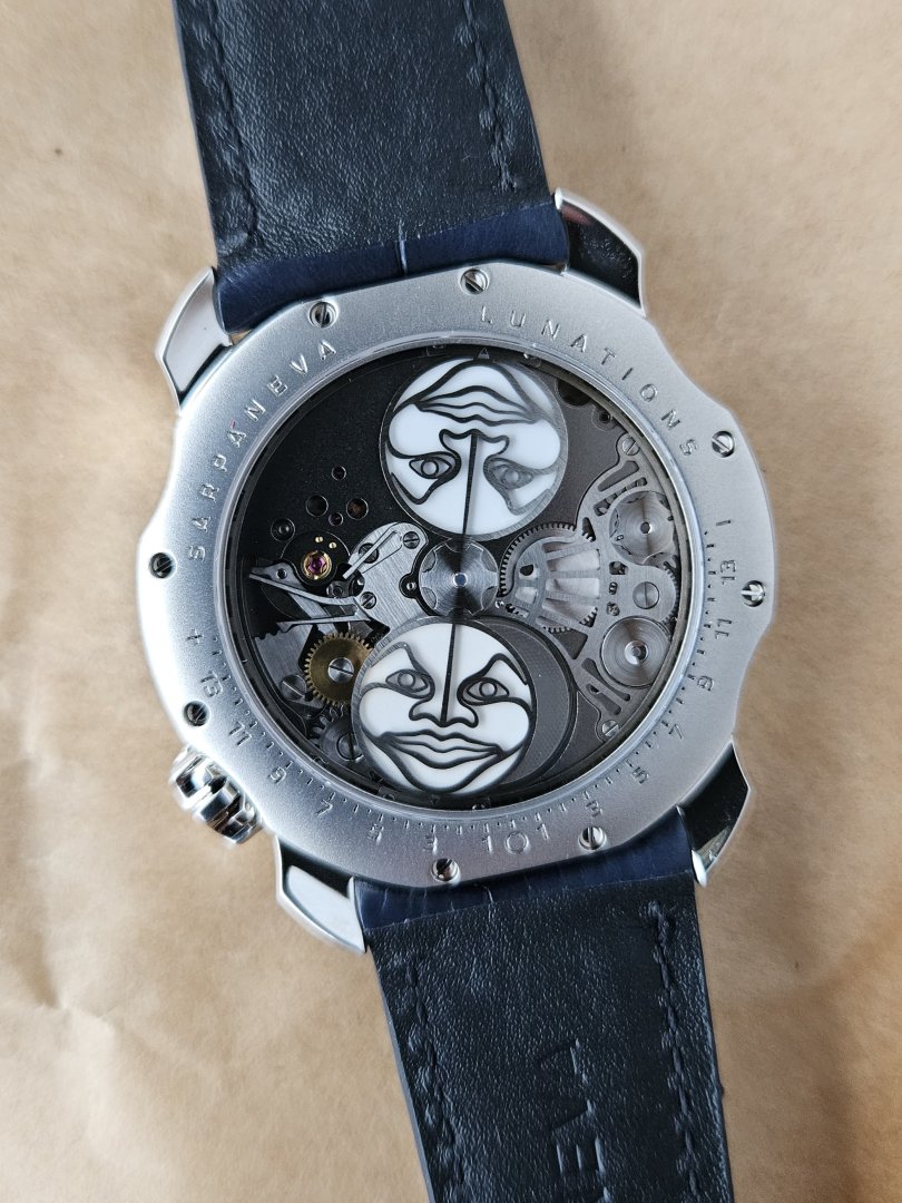 Ett og et halvt år etter jeg tok kontakt med Stepan, er den her - Sarpaneva Lunations. Denne ble lansert i 2019, og har Stepan Sarpanevas første inhouse urverk, Moonment, utviklet i samarbeid med Andreas Strehler. Månefasen har en presisjon som gjør at det vil gå 14000 år før den er ett døgn i utakt (bare slått av Strehlers egen). Kombinasjonen av design, håndverk og presisjon var uimotståelig, og at sjefen sjøl bare lager 5-6 av disse i året forsterker det. Etter et besøk på verkstedet i mars i fjor, var det bare å begynne å spare, helst raskere enn eurokursen steg.