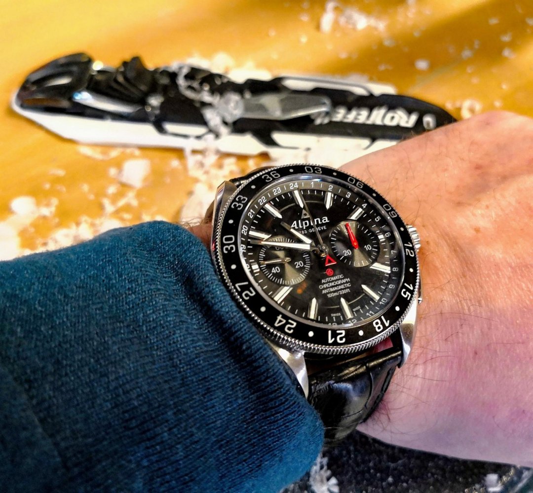 Svært lite brukt Alpina Alpiner 4 Chronograph med skinnrem. Skinnremmen viser tegn til bruk, ellers er klokken strøken!