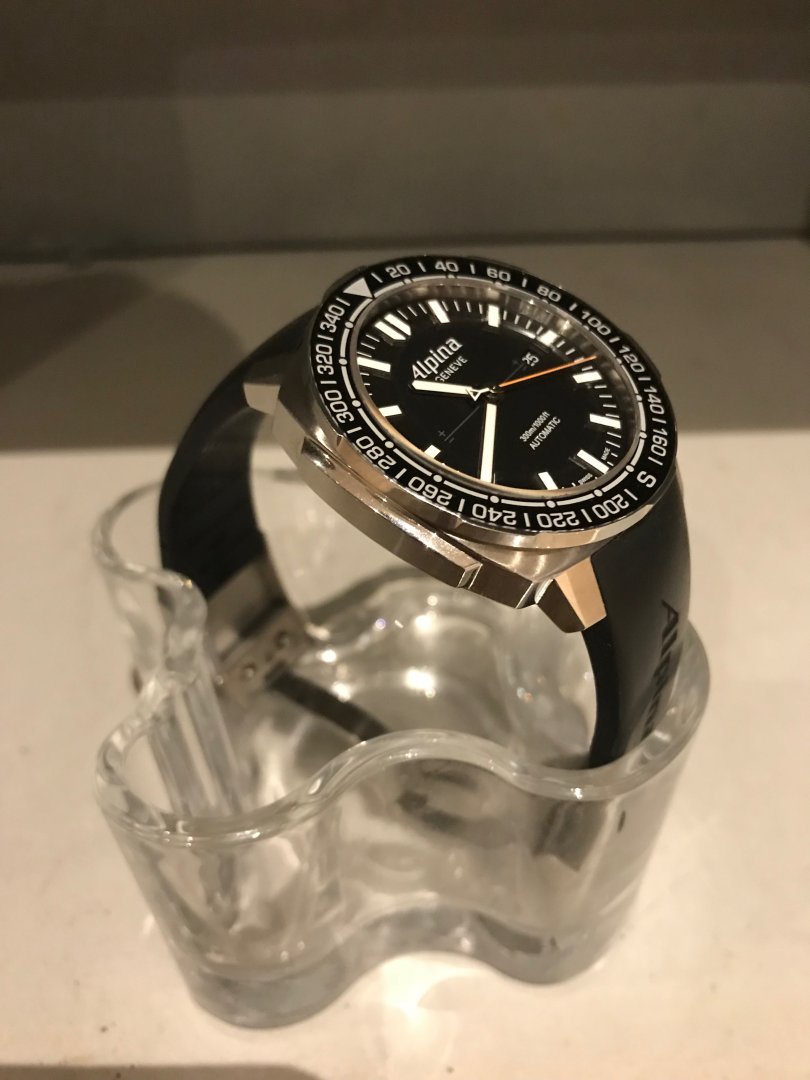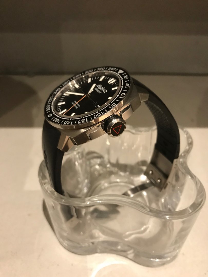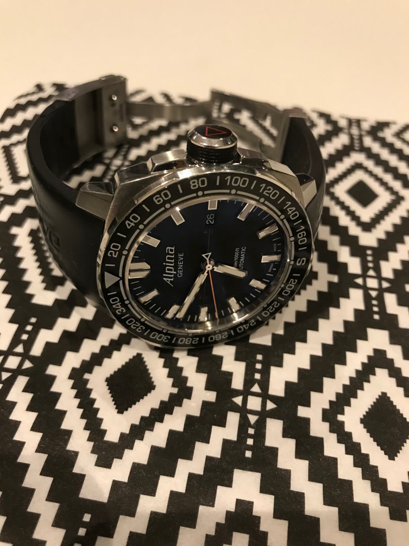 Klokken selges komplett med boks, papirer. Opprinnelig kjøpt i USA. Meget solid og behagelig gummireim, med deployant clasp. Gummireimen er forkortet til å passe håndledd på ca 19cm og nedover.