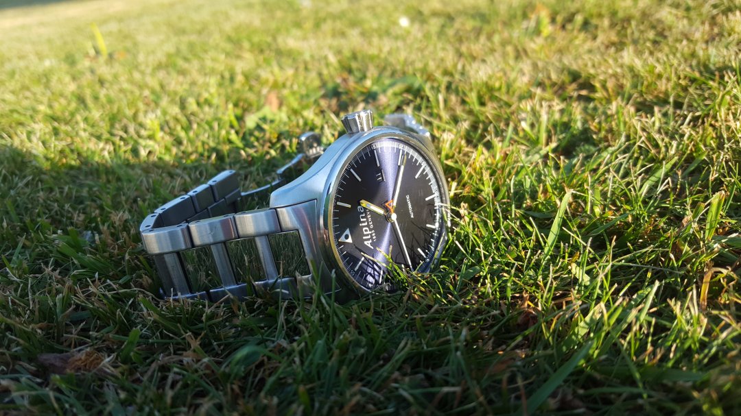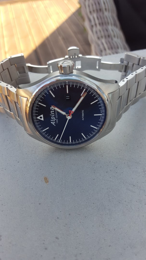 Klokken er i fin stand, hairlines finnes på kasse og lenke, men ingenting som sjenerer. Den går som den skal, følger med innerboks, ytterboks, ekstra ledd, tag, manual, sertifikat og uutfylt garantikort. Ifølge sertifikatet fra alpina er klokken fra juli 2016. Klokken er kjøpt av GG på klokkeriet. Klokken har en utrolig fin navy blue sunburst skive som virkelig kommer til sin rett i solen. Er blå, svart og lilla nyanser i skiven. Pga skiven vil jeg påstå at dette er en skikkelig tøff sommerklokke.