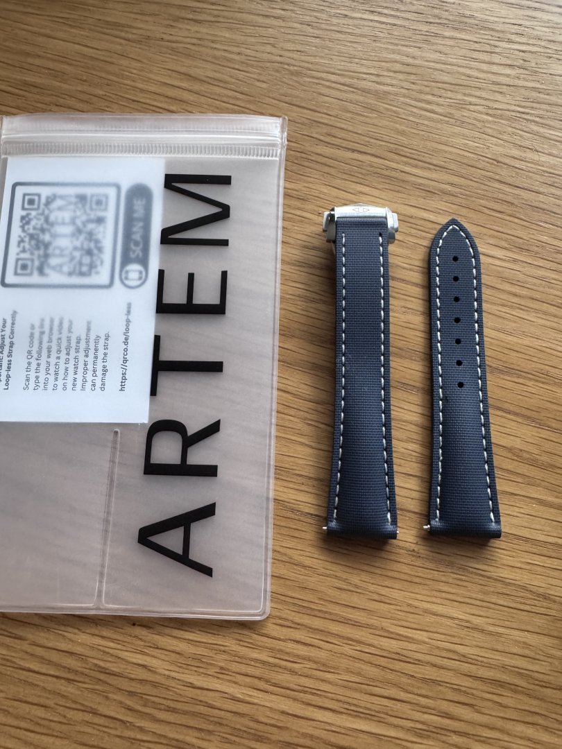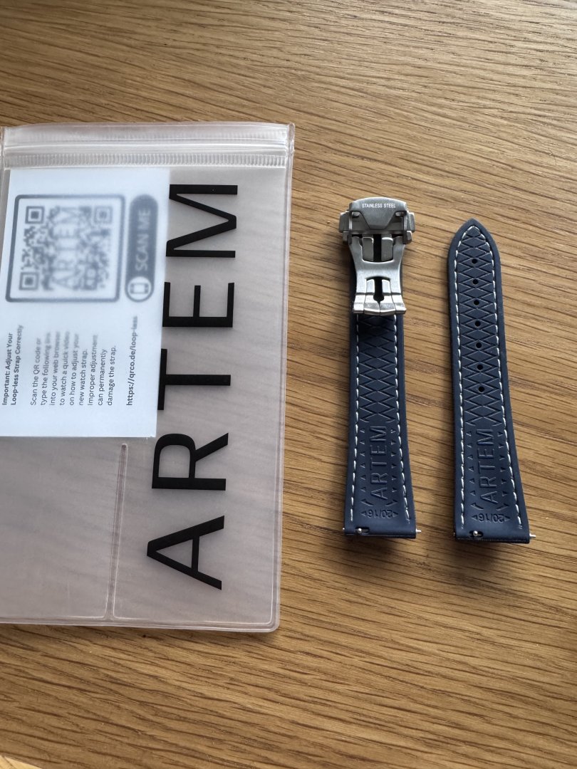 De er myke og meget høy kvalitet som man kan forvente av Artem. Den har brukt ca to ganger av meg og dermed er som nye. Bredden er 20/16 mm og kommer med quick release. Følger også med Artem deployant clasp. Lengden er standard 97/100 mm.