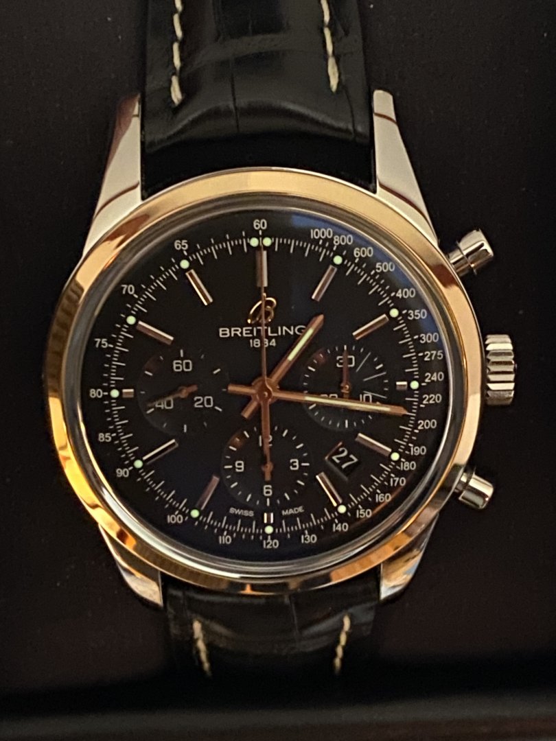 Modellbetegnelsen er UB015212/BC74. Urverket er B01, diameter 43mm og oppgitt vanntetthet 100m. Denne utgaven er levert med 18K gullbesel, samt visere og markører. Som ny crocoreim og foldelås.