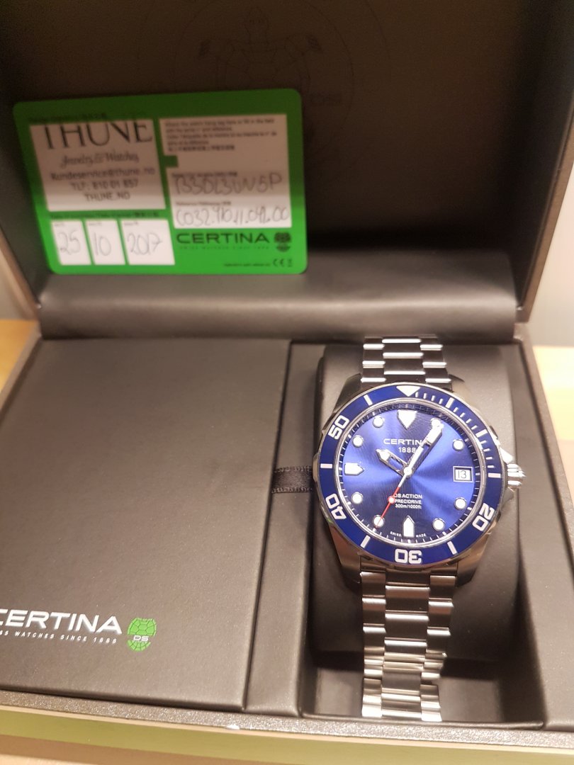 Herreklokke med blå urskive og ripesikret safirglass. Tilpasset og brukt ca. 1 uke.
