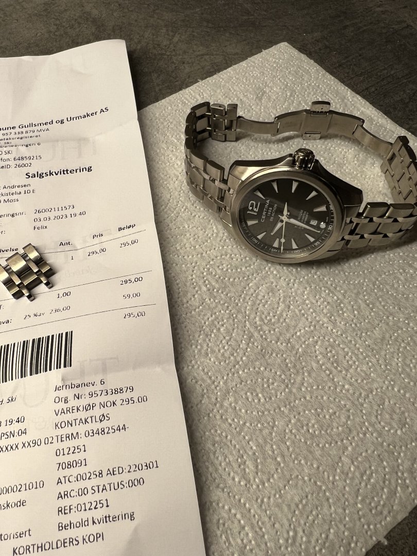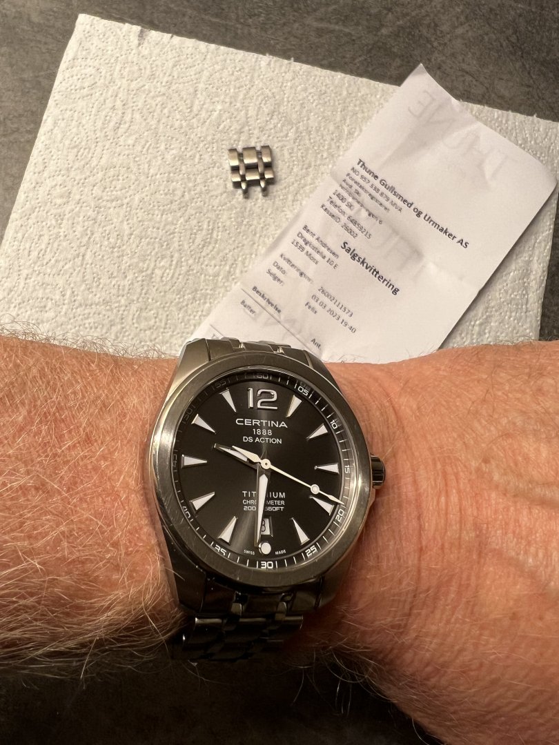 Watch only med alle lenkeledd. Batteribytte / sjekk og trykktest utført 3 mars 2023.