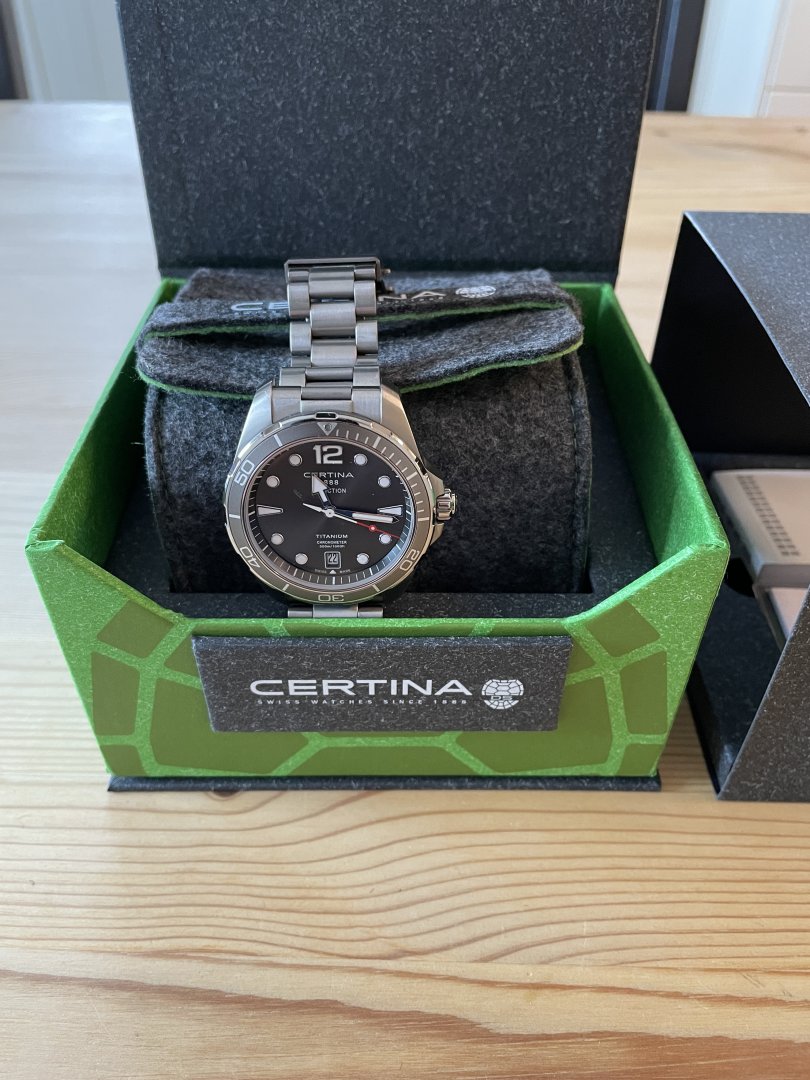 Pent brukt Certina DS action Titanium Quartz selges for kr. 5000,-. Kjøpt av meg for kr. 8290,- hos Thune i Oslo i juli -22. Kommer komplett som den ble levert fra Thune. Kassen måler 43 mm i diameter og har 21 mm lugvidde. Noen uunngåelige hairlines finnes, men klokken er pent behandlet og kun brukt i fjor sommer. Urverket er et ETA-quartz F07.412. Klokken er vanntett til 30 atm. Både kasse og lenke er i titan og claspen har en diver extension som er veldig enkel i bruk (se bilder). Det gjenstår i overkant av to års garanti på klokken. Møtes helst F2F i Oslo/Bærum, men sender på kjøpers regning og risiko etter at penger er på min konto.