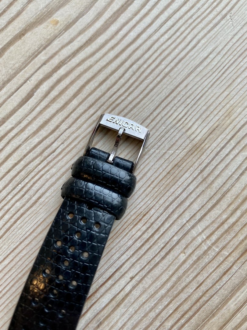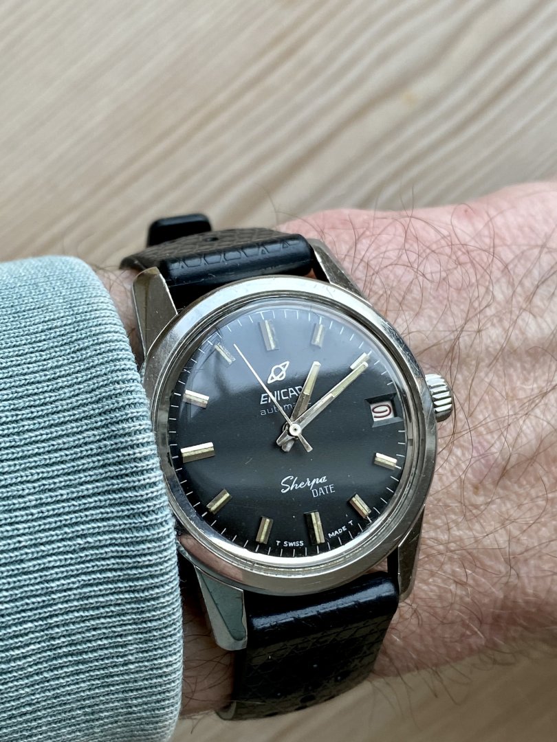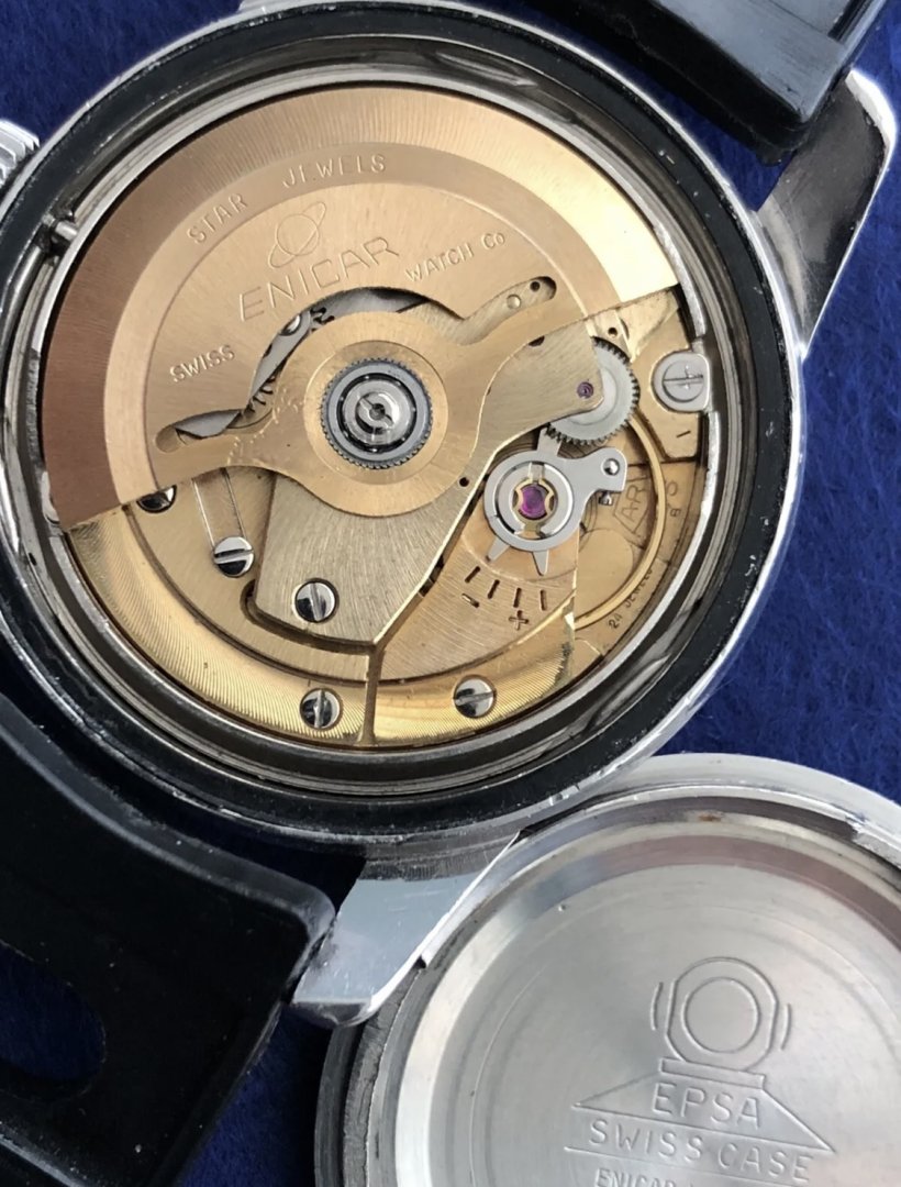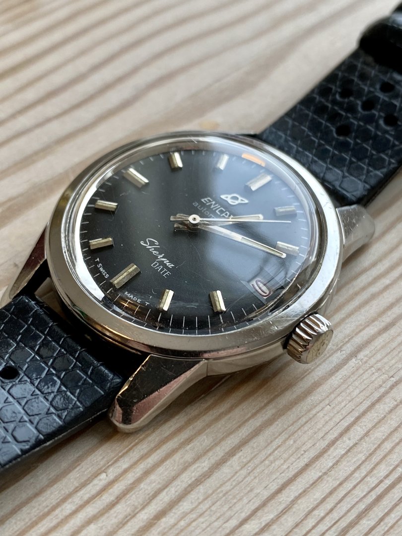 Samlere vet hva dette er og at utgaven med sort skive er mye mer sjelden enn den vanlige i stål. Klokken er i utrolig god stand men med ukjent service og normal men lite alder slitasje. En fantastisk klokke med mye krutt, Enicar urverk i Epsa super compressor kasse og signert krone. klokken trekker og går flott, har ikke målt tidsavvik.