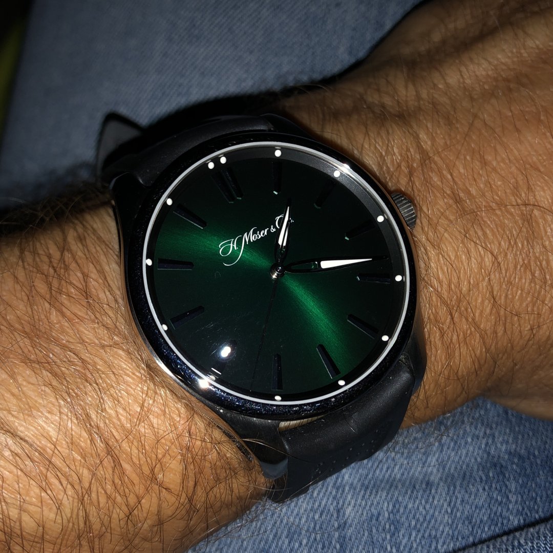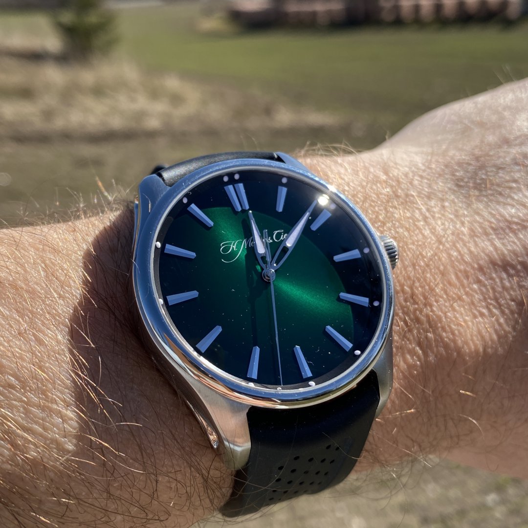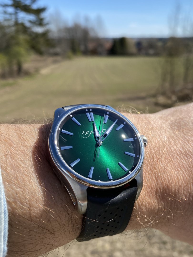 Mange snakker om skivene til Moser, som absolutt er en del av Moser sin "signatur". Skiven på denne kalles "Cosmic green Fumé", og den er en nesten magisk grønnfarge. Svært levende og fargenyansen skifter med lyset fra nesten svart til skinnende grønn! Men kassen er også spesiell på denne klokken. Den er 42,8mm, men har en form som gjør at den "omfavner" håndleddet så den ligger usedvanlig godt til størrelsen. Soleklart mest komfortable "store" klokke jeg har prøvd! Sidene på kassen er også helt unike! Veldig fine