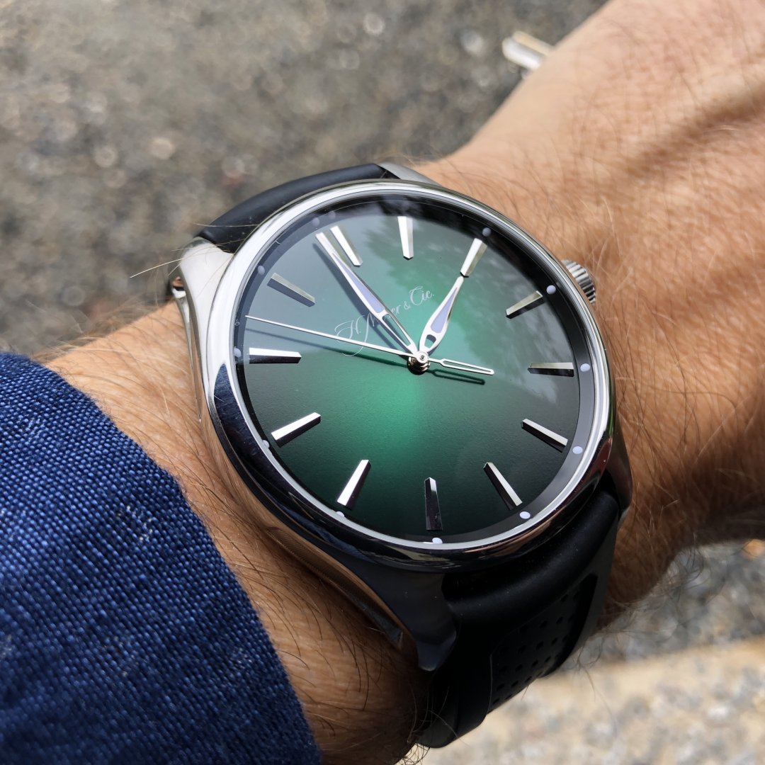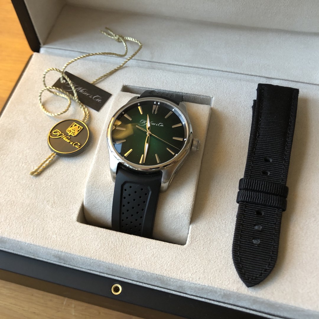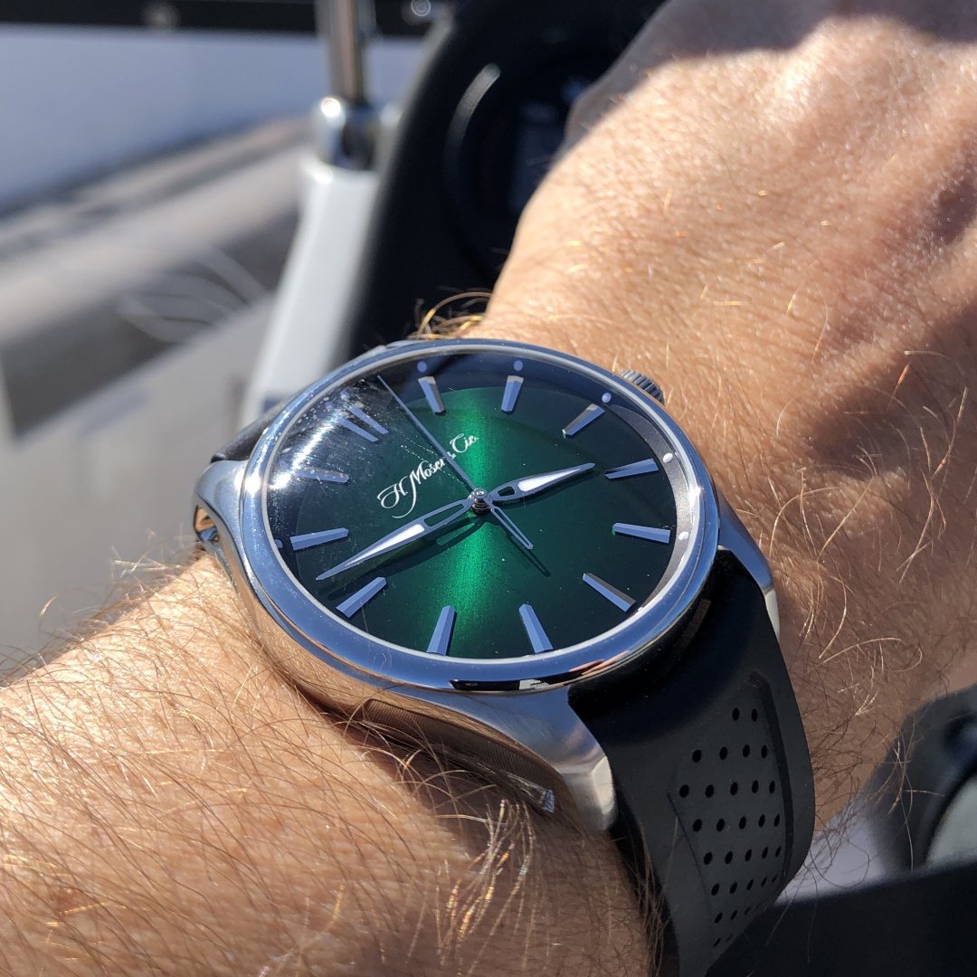 Mange snakker om skivene til Moser, som absolutt er en del av Moser sin "signatur". Skiven på denne kalles "Cosmic green Fumé", og den er en nesten magisk grønnfarge. Svært levende og fargenyansen skifter med lyset fra nesten svart til skinnende grønn! Men kassen er også spesiell på denne klokken. Den er 42,8mm, men har en form som gjør at den "omfavner" håndleddet så den ligger usedvanlig godt til størrelsen. Soleklart mest komfortable "store" klokke jeg har prøvd! Sidene på kassen er også helt unike! Veldig fine