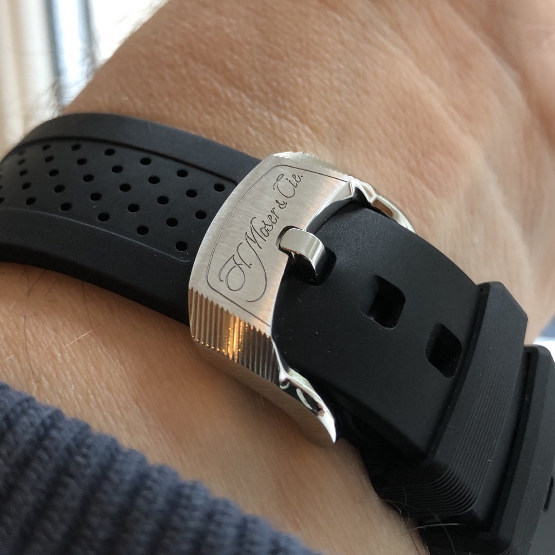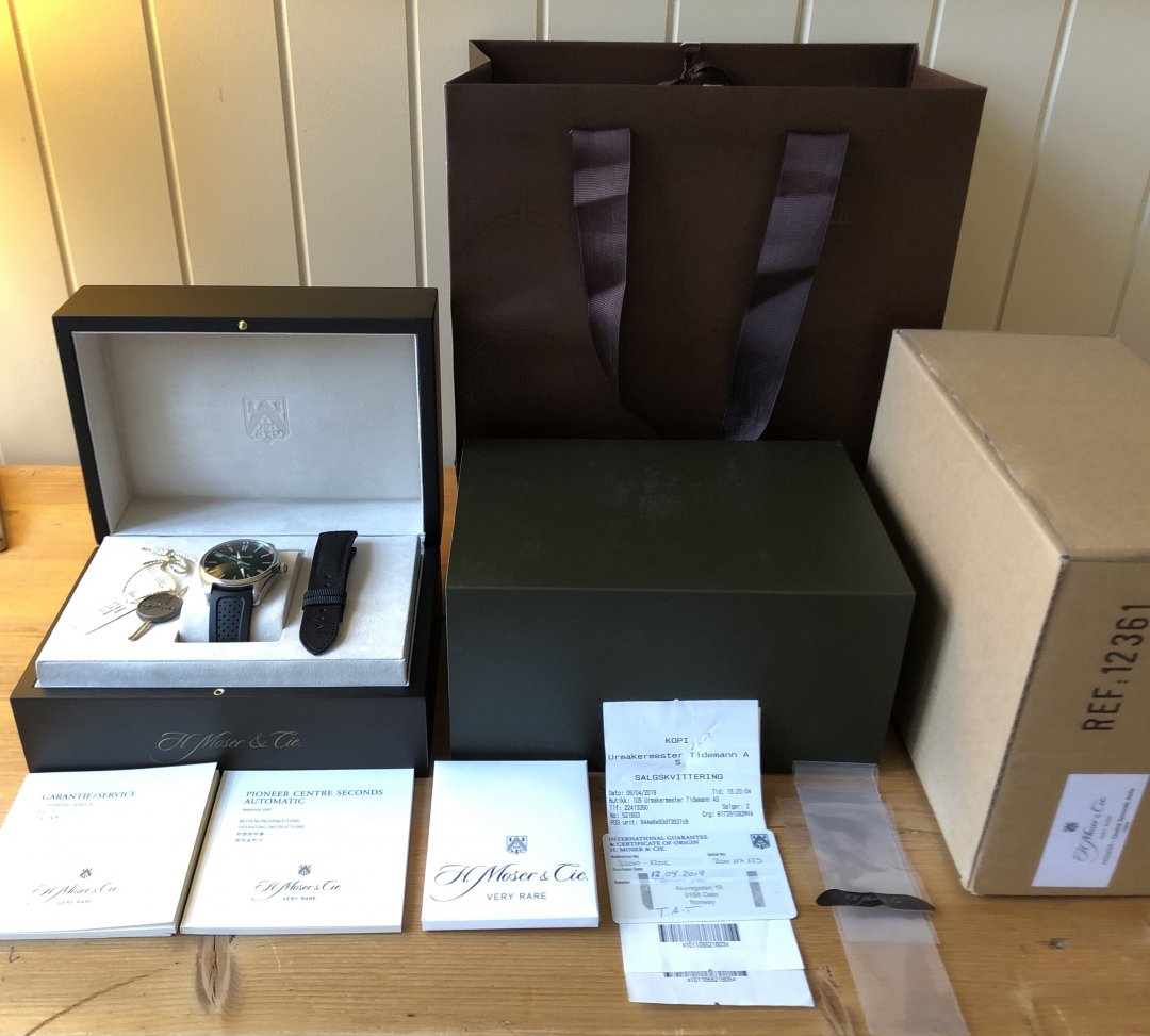 Klokken er brukt i rotasjon med flere andre, og den er dermed lite brukt (vil anslå rundt 30 dager) og meget pen. Men hairlines kommer det jo alltid på første dagen, så de finnes her også. Klokken kommer med to originale Moser-remmer. Den ene (standard-remmen til klokken) er en slags nylon-rem, som første eier aldri brukte, og jeg har brukt den en håndfull ganger. Den andre er verdens beste, mykeste og mest behagelige gummirem du kan tenke deg! Dette er remmen som hovedsaklig har vært brukt, men ingen bruksspor av betydning på den heller.