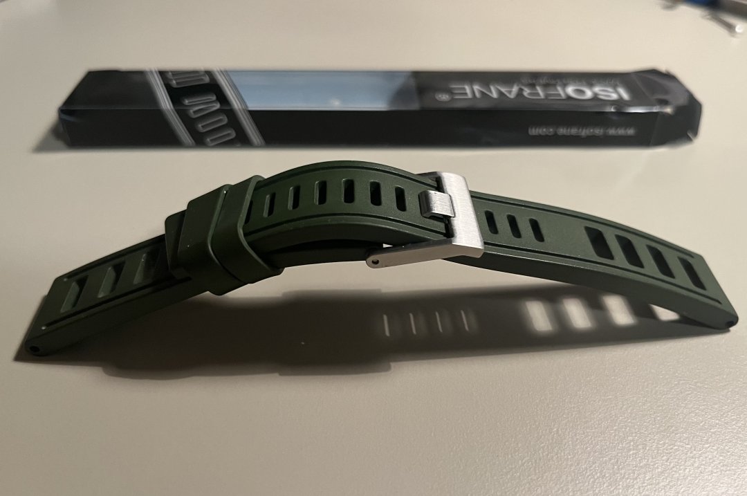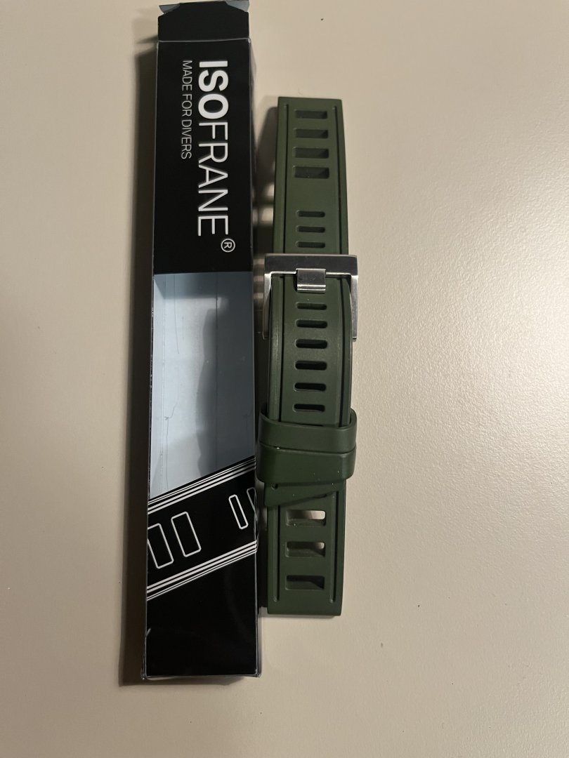 Fin grønn Isofrane, 20 mm, med stål buckle, selges kr 900 pluss evt frakt. Kan også hentes i Sandnes.