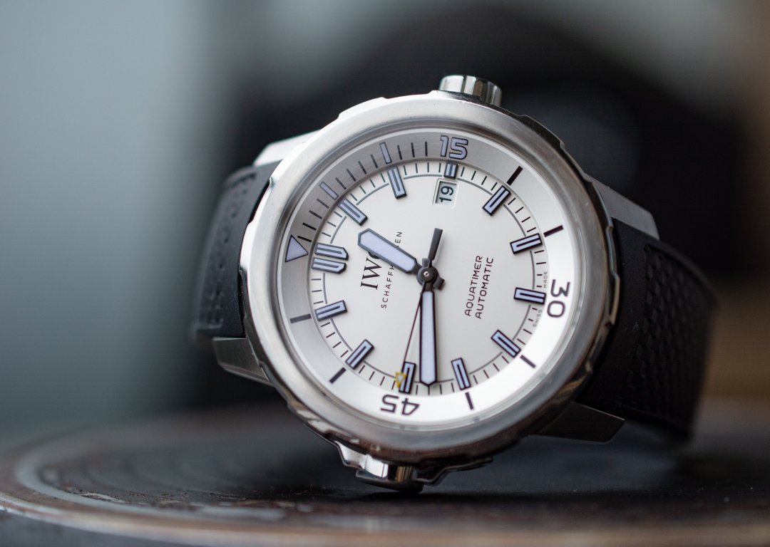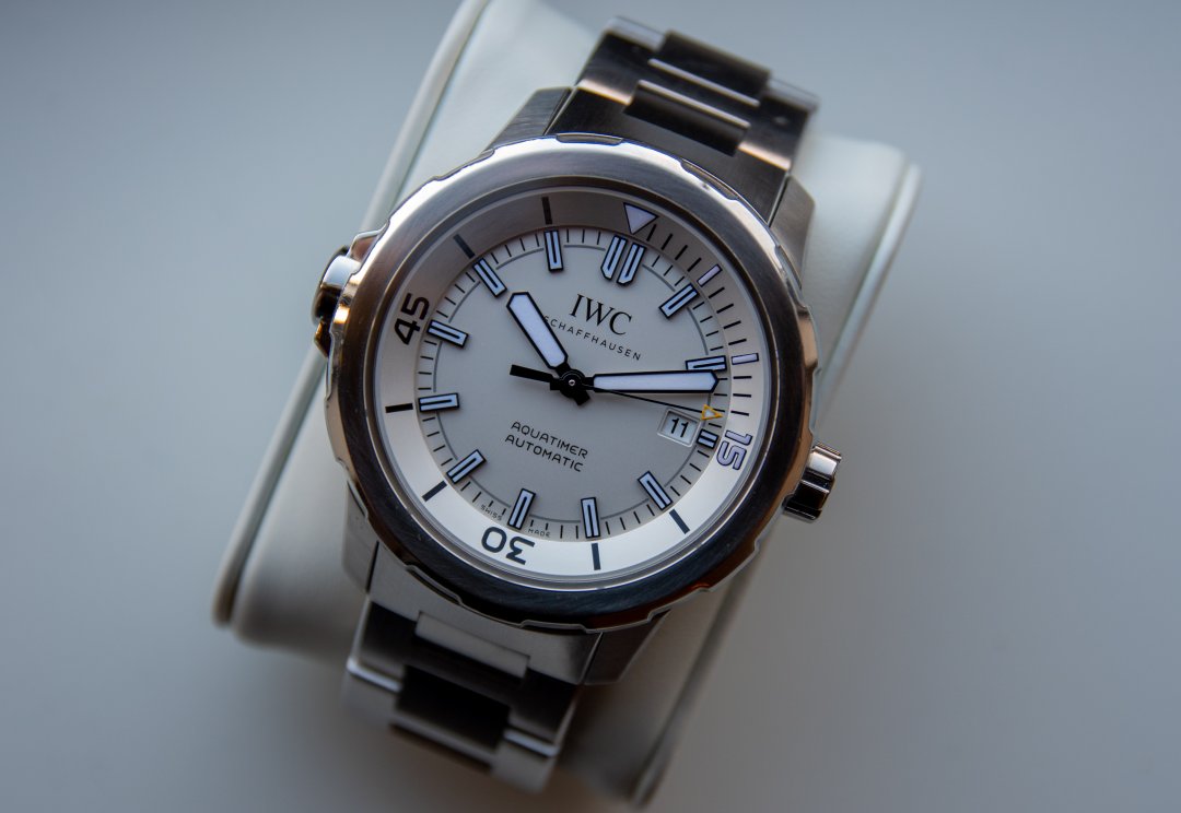 Selger min flotte IWC Aquatimer med hvit skive – modellnummer IW329004. Med klokken følger både lenke og gummireim – begge selvsagt IWC-originale.