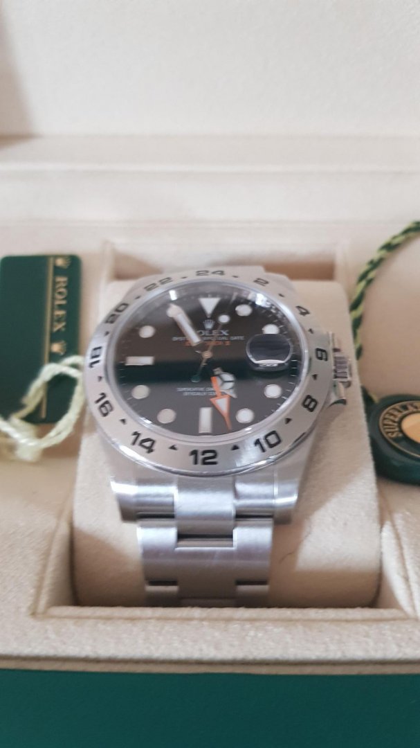 Lufter min Explorer 2 fra 2016 for salg. Den ble nylig kjøpt av en GG, men har i etterkant funnet ut at den er litt for stor for min smak. Den ble kjøpt i april i 2016 hos Askeland, og ble ifølge tidligere ikke brukt mye av første eier, og heller ikke av ham, noe som er gjenspeilet i urets stand. Den har noen obligatoriske hairlines, men de synes kun i direkte lys og riktig vinkel. Har prøvd å framheve dette i bildene som er tatt i godt lys. Uret går svært nøyaktig, som det skal, og har ikke behov for service.