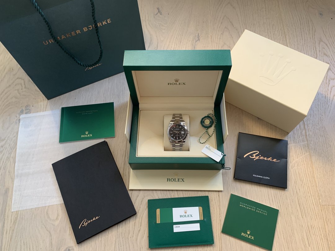 Uret er kjøpt nytt hos Urmaker Bjerke i Oslo i juli 2018 og kommer helt komplett med esker, manualer, kvittering, ekstra ledd samt sertifikat.