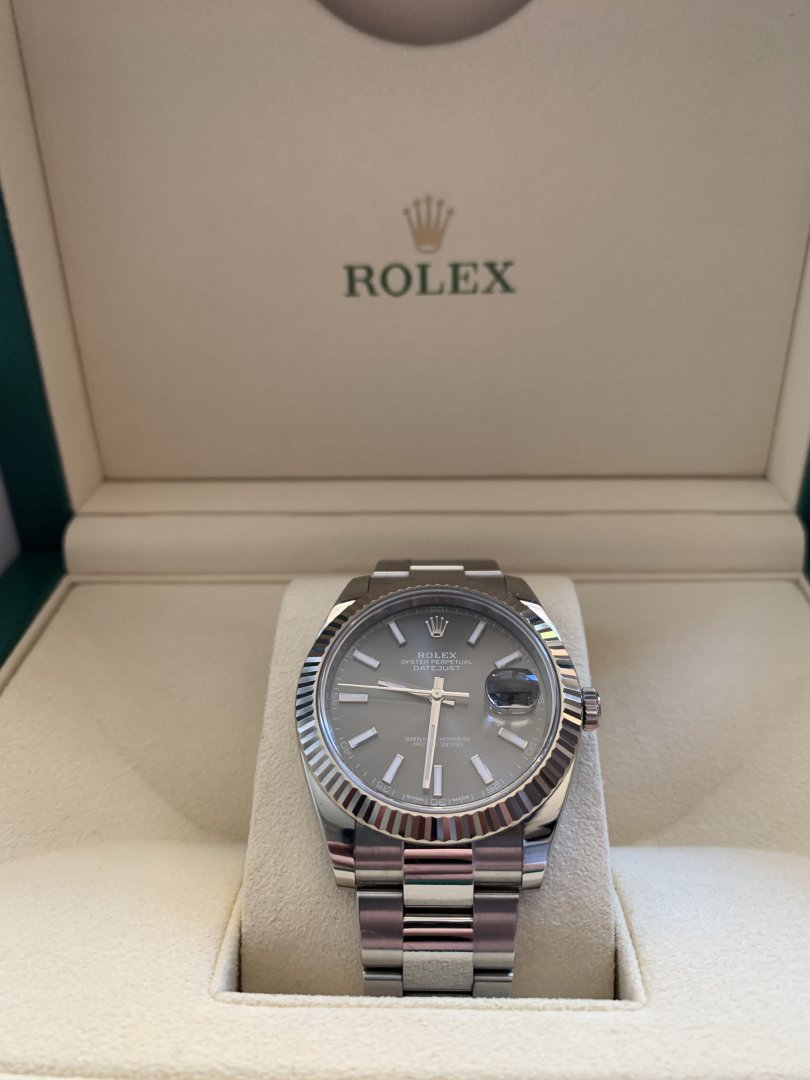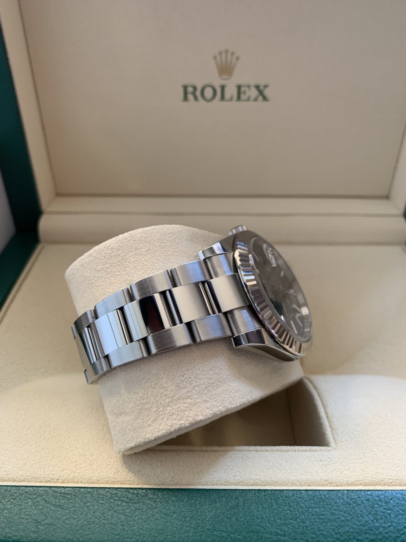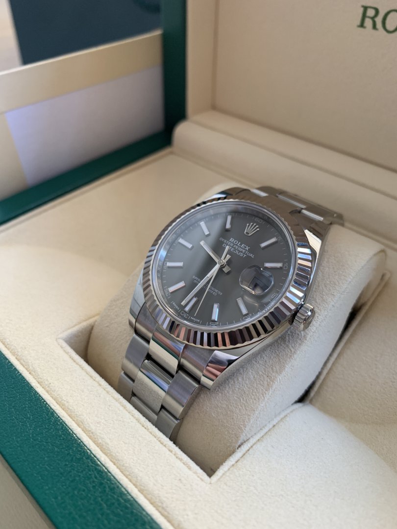 Selger en pen Rolex Datejust 41 ref. 126334 med rhodium-skive, fluted bezel I hvitt gull og Oyster-lenke.