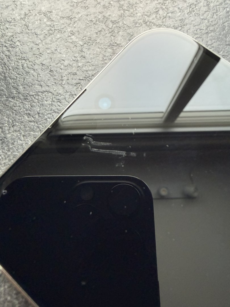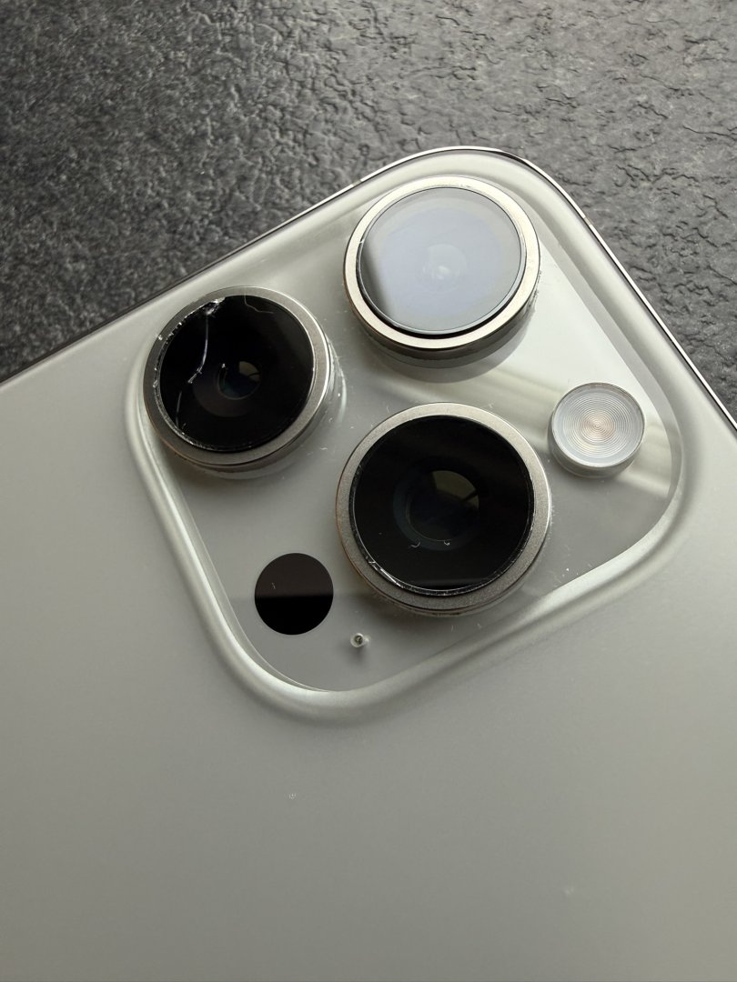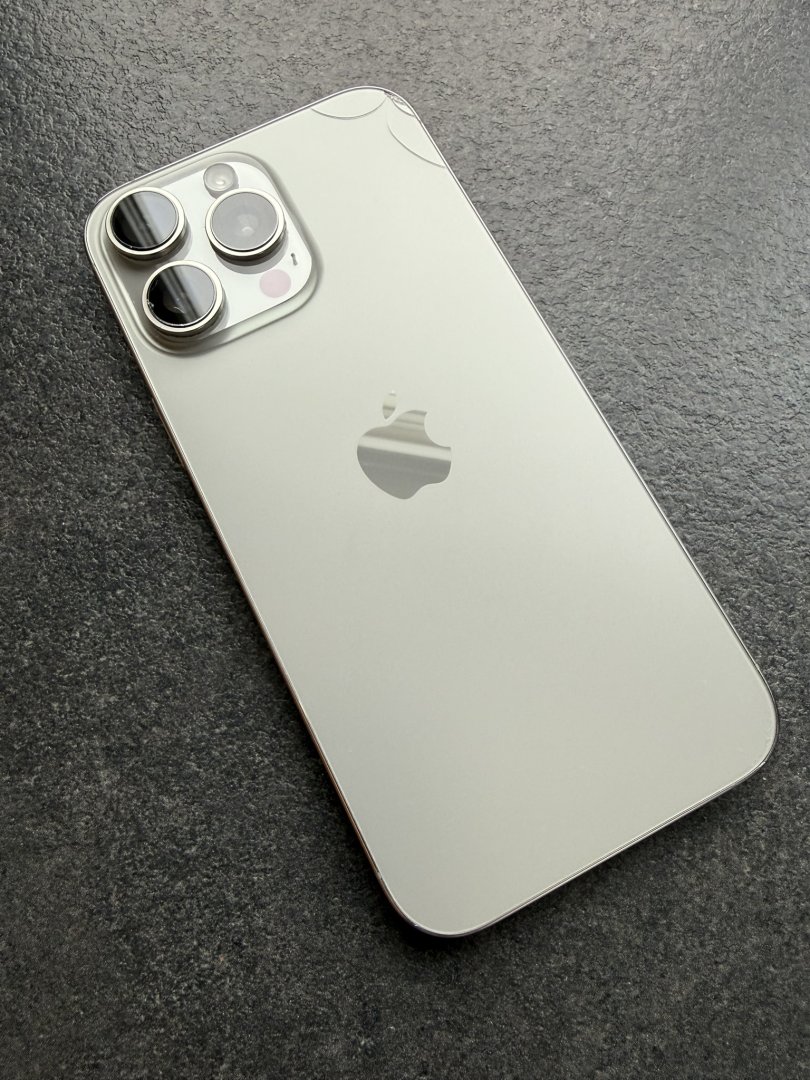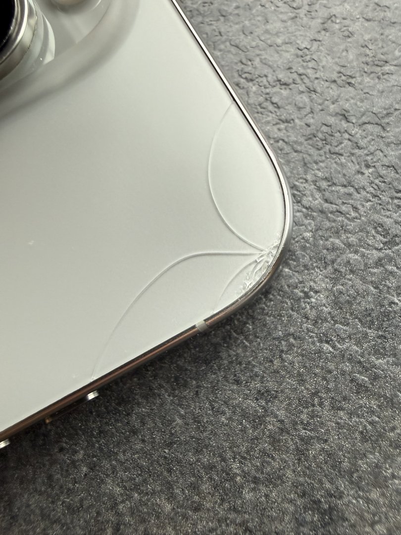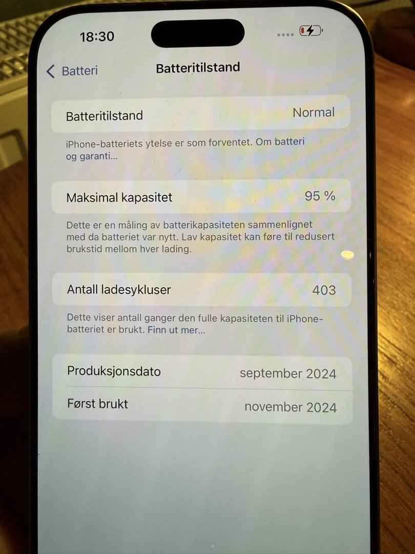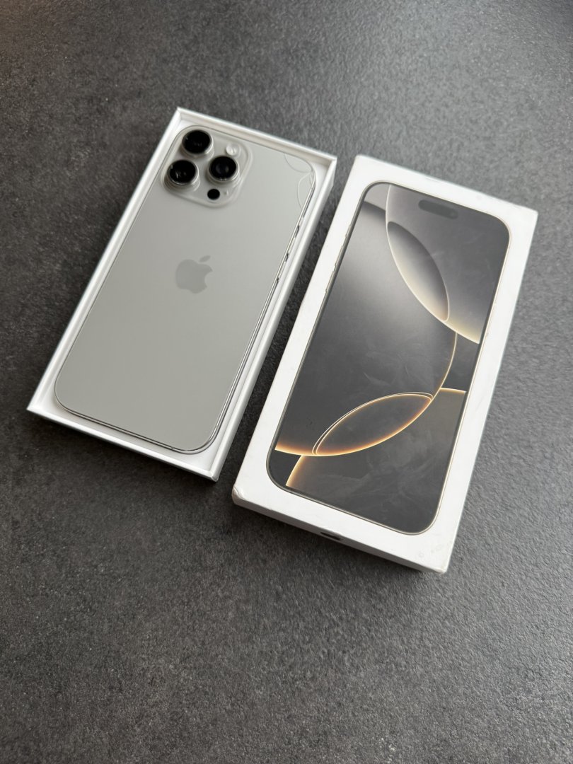 Apple iPhone 16 Pro Max med 512 GB lagringskapasitet. Mobiltelefonen har en skjerm med riper og en sprekk i bakdekselet. Selges med original eske, men uten ladeledning (vanlig USB C) Telefonen fungerer 100% som den skal.