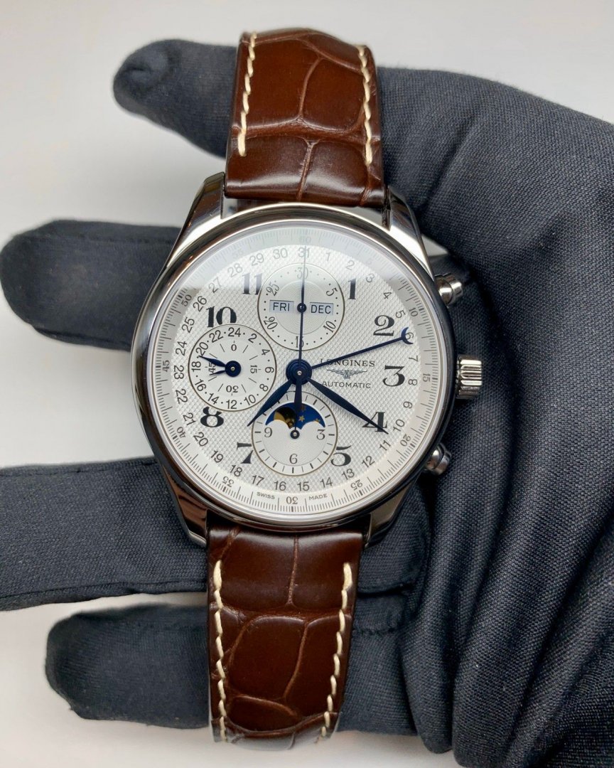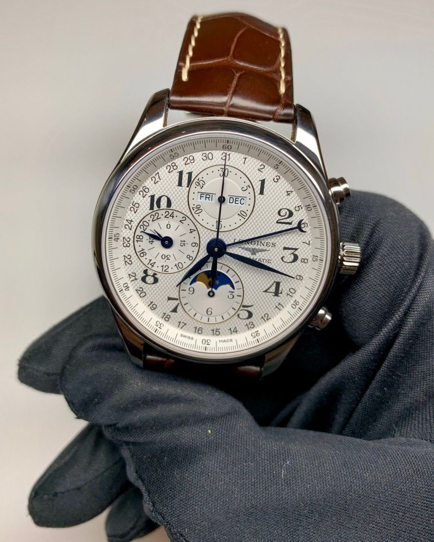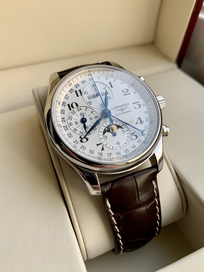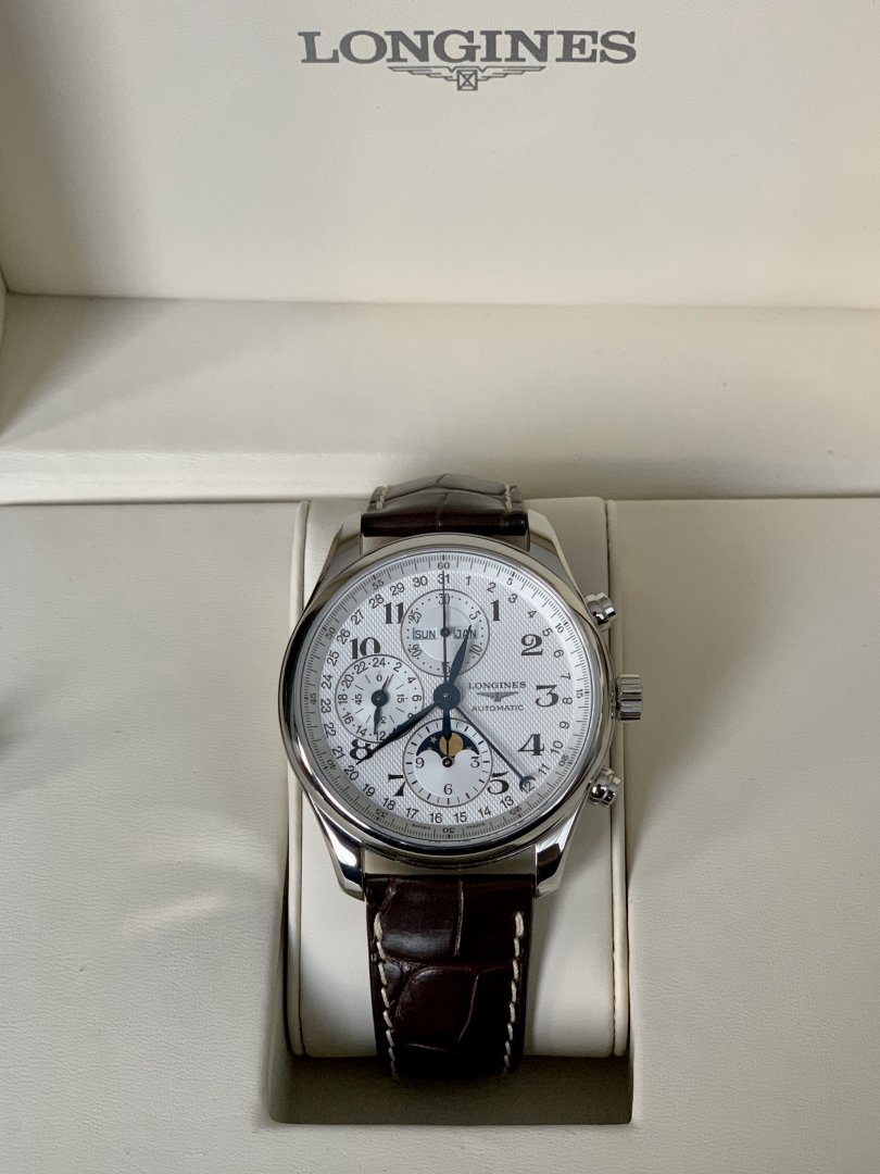 Til salg er en meget flott Loninges Master Collection Moonphase. Klokken er lite brukt og er i utrolig god stand, så å si nytt. Jeg er andre eier, men klokken har vært ubrukt fram til jeg kjøpte den i desember. Klokken er 42 mm, og sitter utrolig godt på hånden. Boks og stemplet garantikort følger selvfølgelig med, og jeg har i tillegg hatt klokken inn til urmaker for regulering.