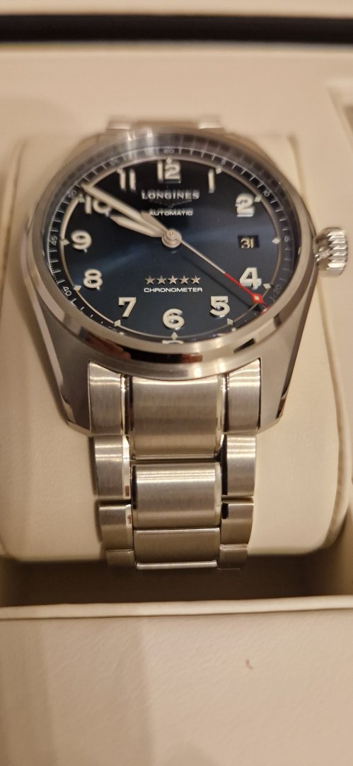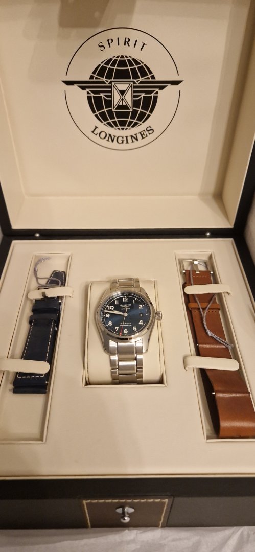 Selger en helt ny og ubrukt Longines Spirit med blå skive. Dette er prestige edition utgave med ekstra originale Longines skinn remmer i matchende blå samt brun farge i tillegg til original lenke. Det er easy changable mekanisme på lenke/remmer, gjør bytte enkelt uten verktøy.