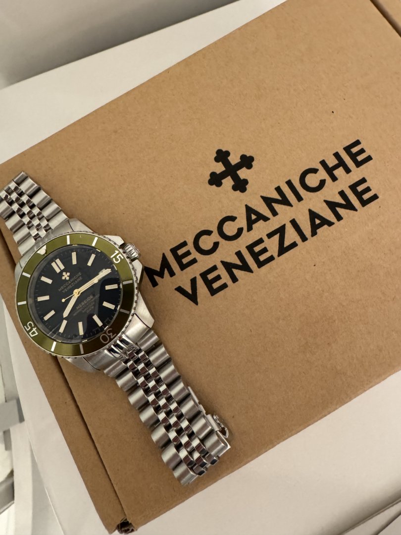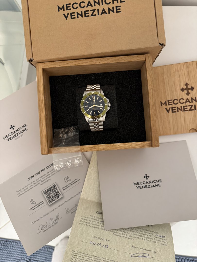 Påkostet modell med sort skive indexer og visere med gullfarge likeså rotor. Bezel mosegrønn. Veldig pen klokke dette.