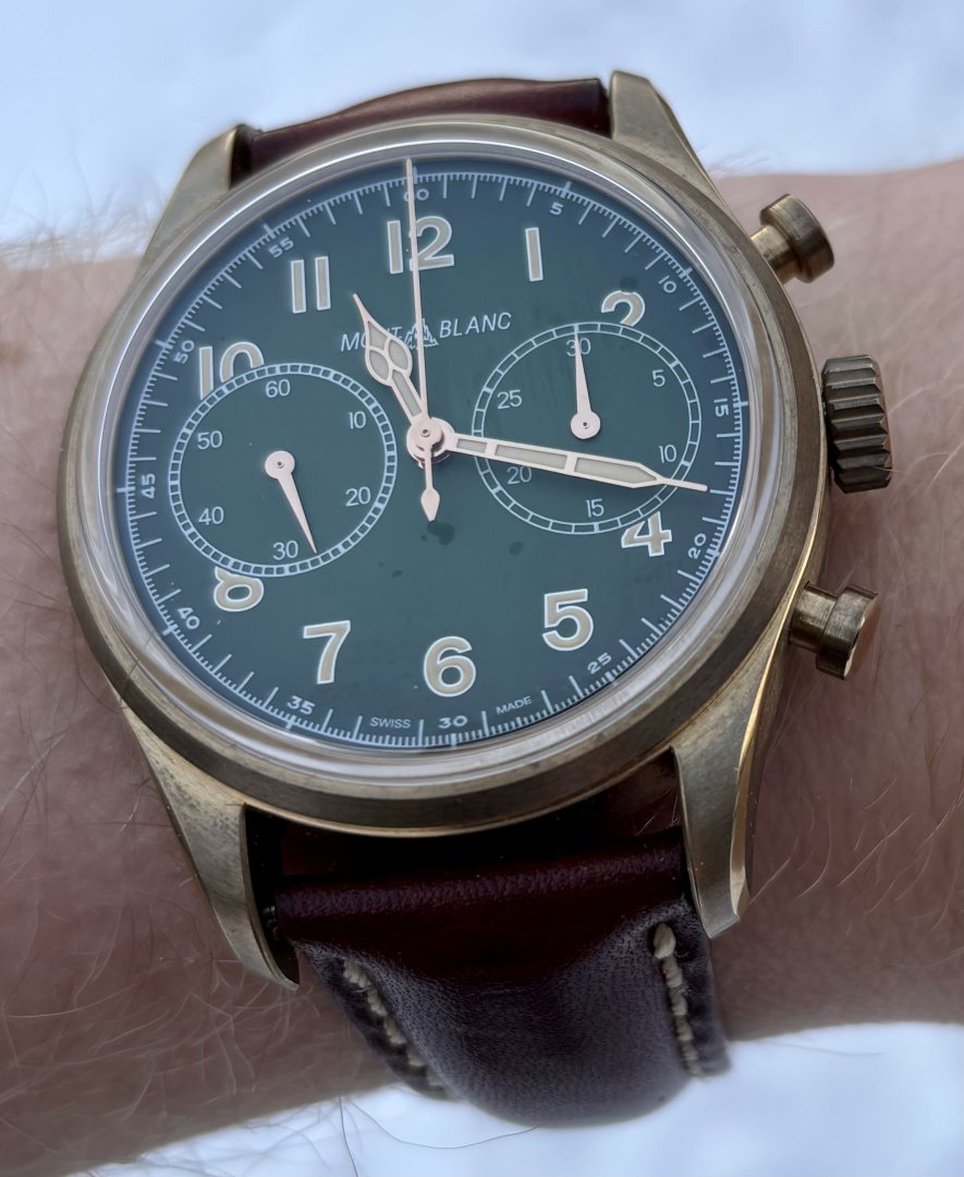 Svært pen limited edition Montblanc 1858 bronze chronograph med grønn skive vurderes solgt. Klokken har kun vært på hånden ved et par anledninger og ble kjøpt ny hos norsk autorisert forhandler i november 2025. Nypris på denne klokken er cirka 56.000 kroner.