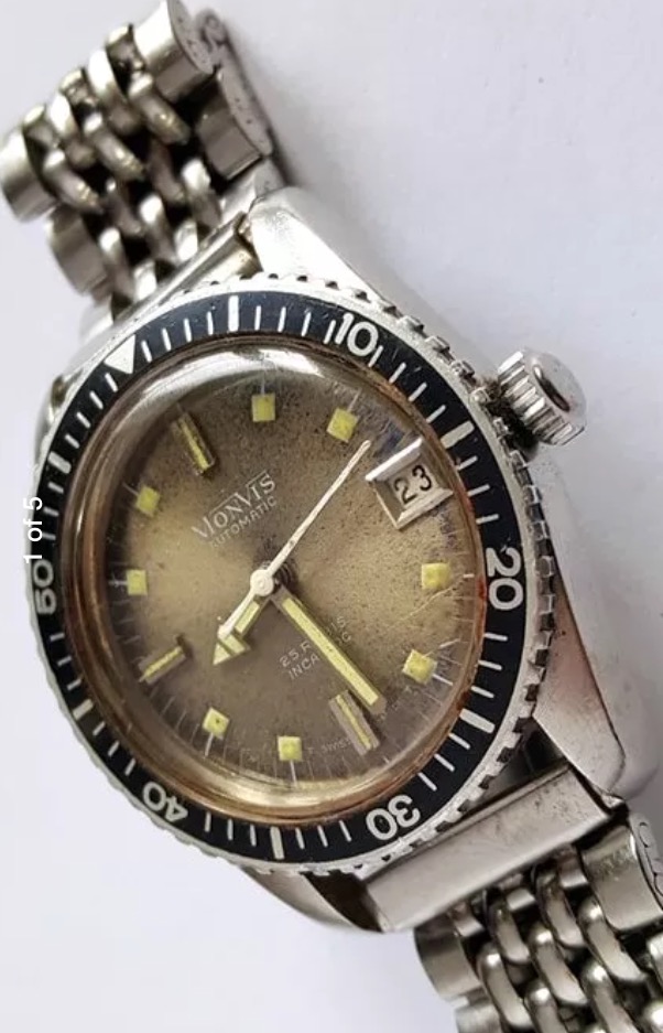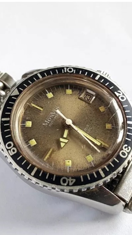 Klokken er på cirka 35mm uten krone. Skrukrone, automatikk og en flott skive falmet av solen.