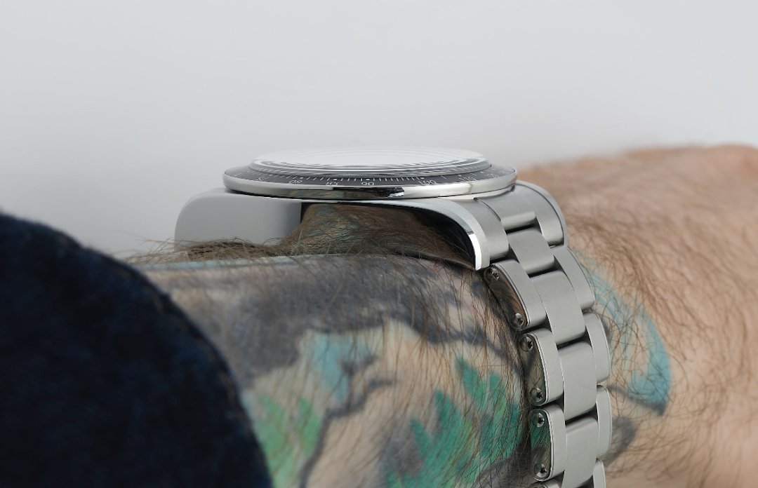 Fixed 316L steel bezel with matt black anodised aluminium disc with tachymetric scale and silver markings