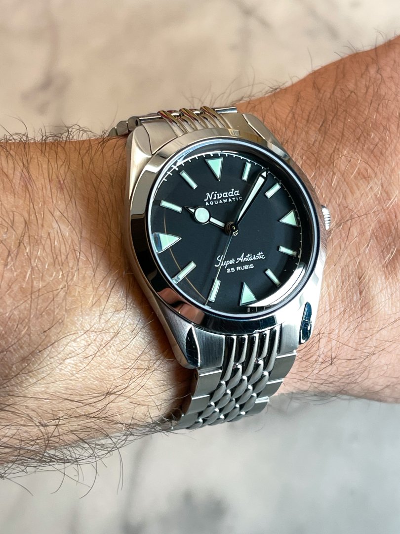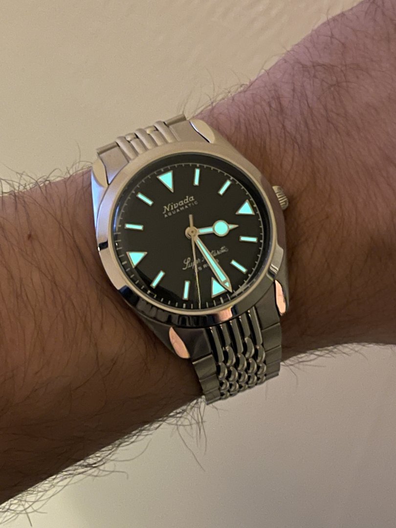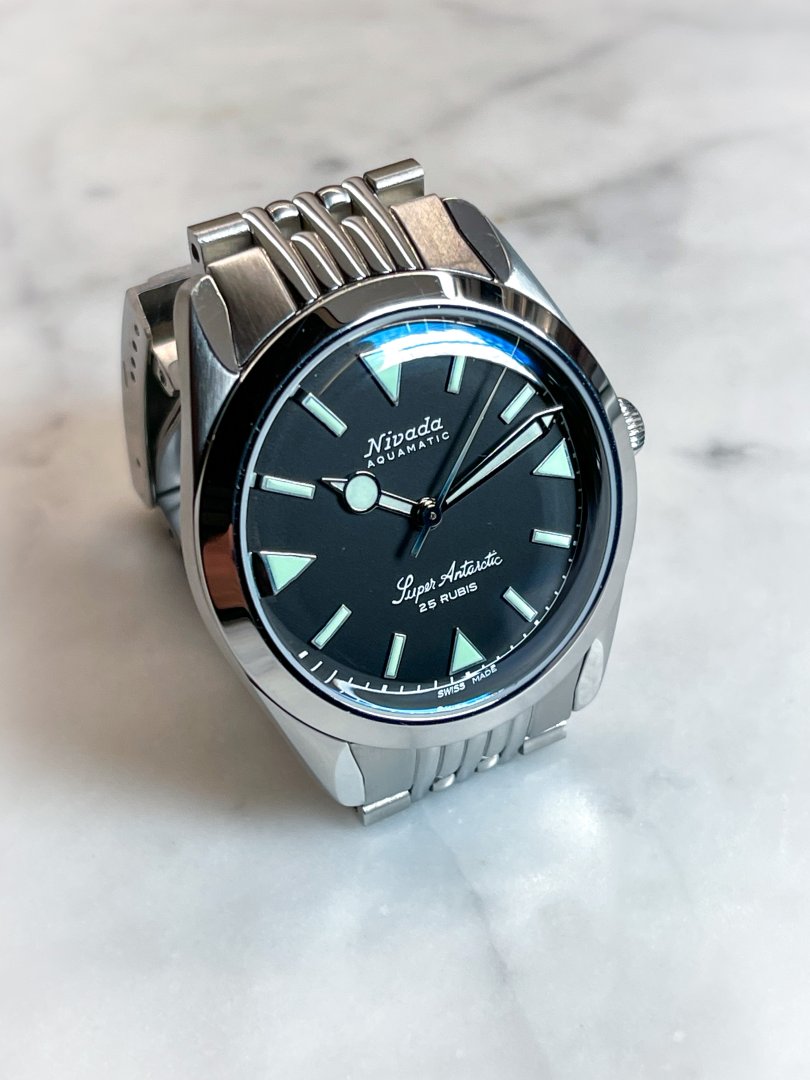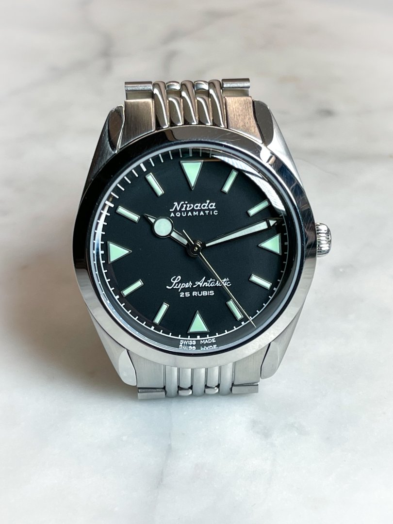 Dial: Vertical Matt solid black with Shiny silver indexes and green Super Luminova