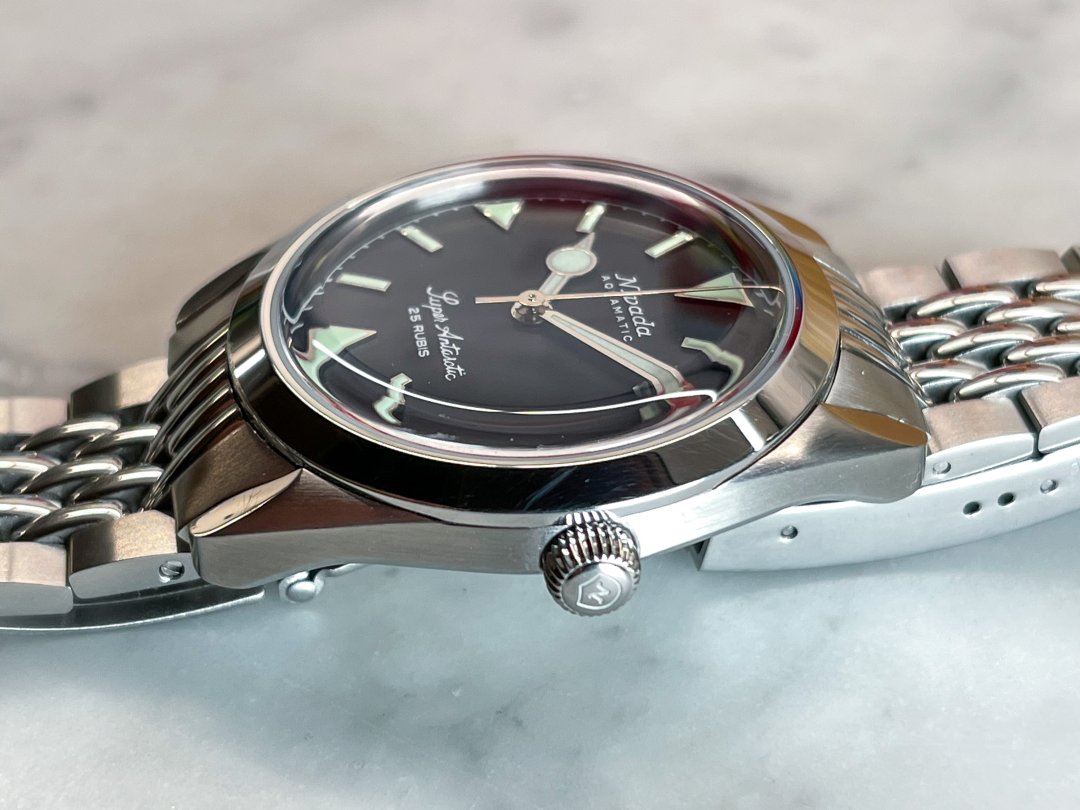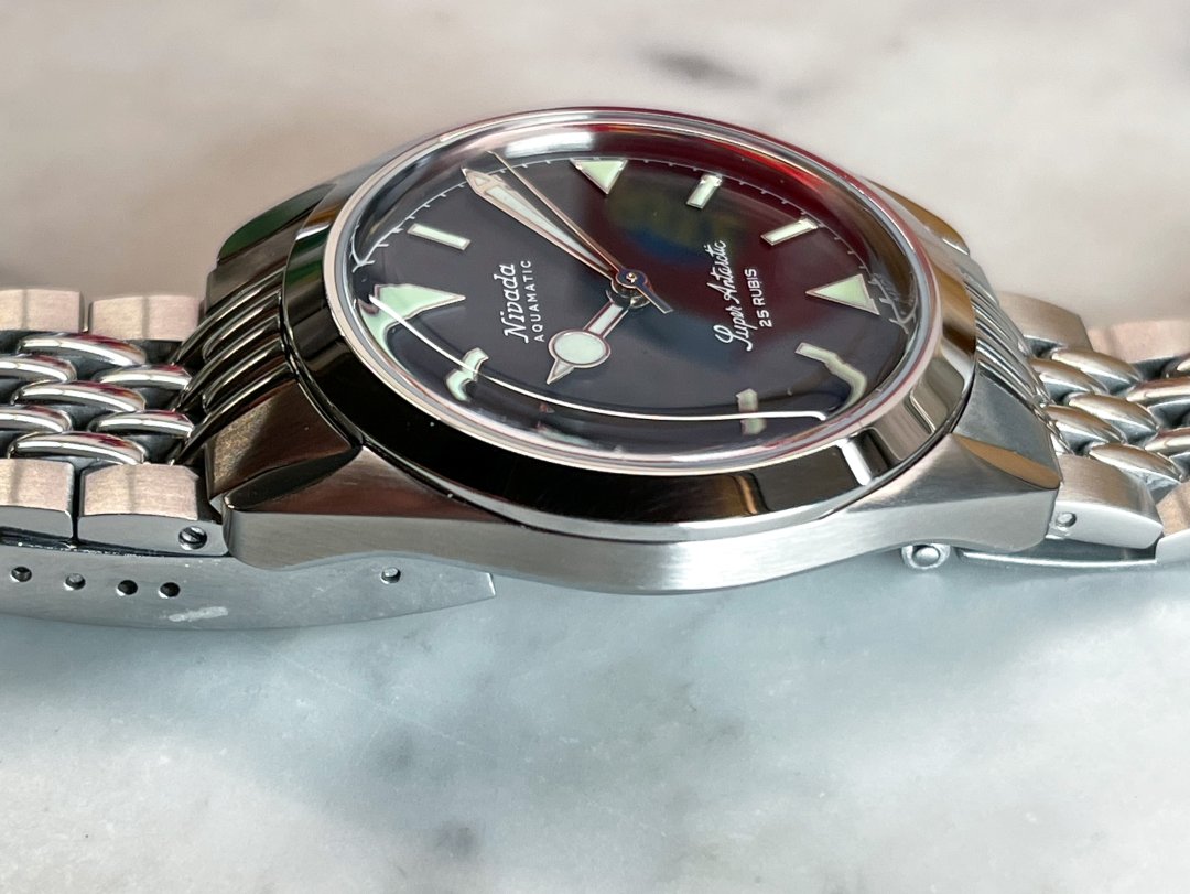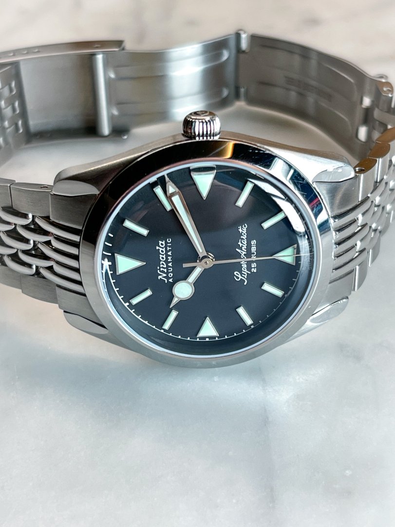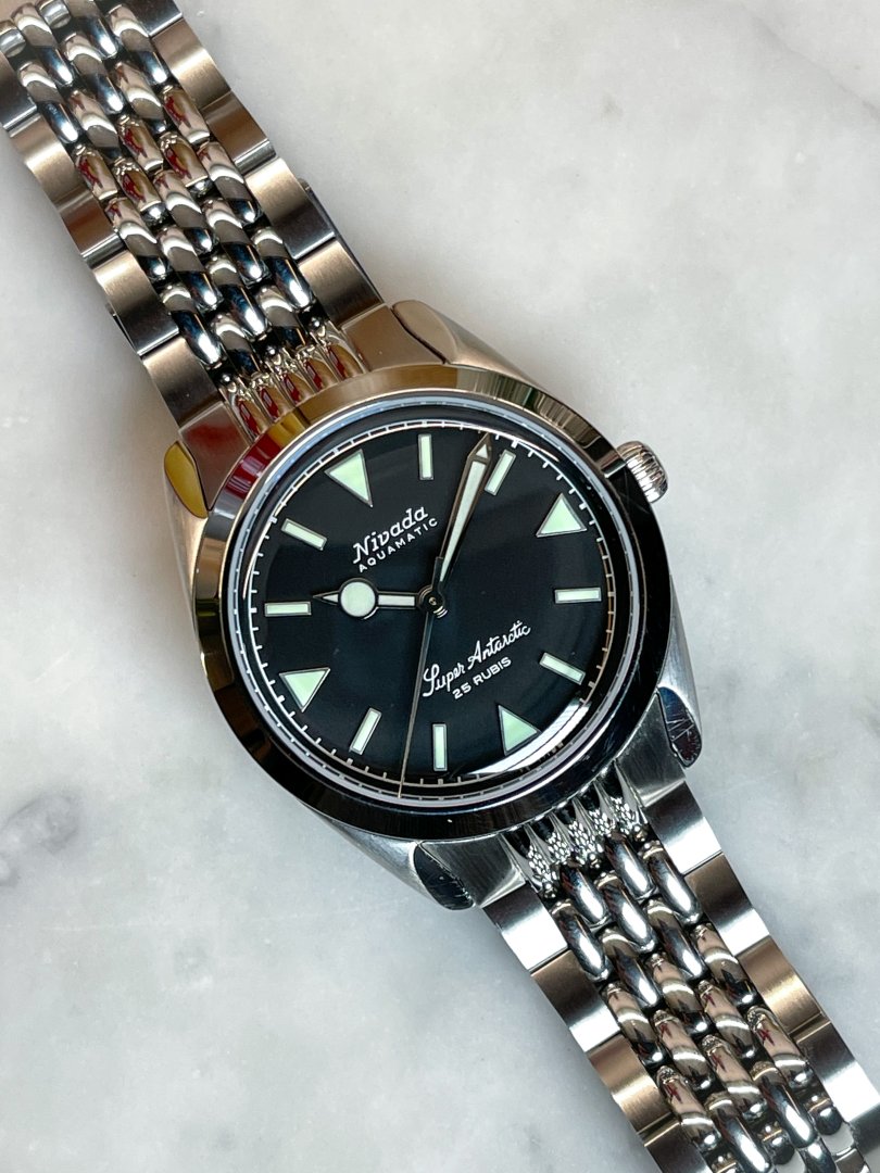 Dial: Vertical Matt solid black with Shiny silver indexes and green Super Luminova