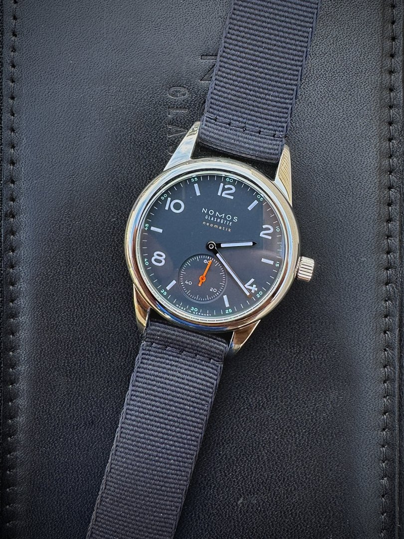 Etter min mening den fineste fargen (petroliumsblå/sort avhengig av lyset) og størrelsen (bærer stort pga lange lugs), samt det beste inhouse verket (med innsyn) og heldigvis uten dato som forstyrrer skivedesignet og kun er til irritasjon om man skifter klokker hyppig. Og uten det pussig rotete California dial greiene de holder på med. Sweet spot som var en så god kombinasjon at Nomos sluttet å lage denne modellen. Uforståelig for meg.