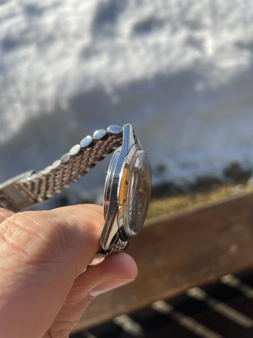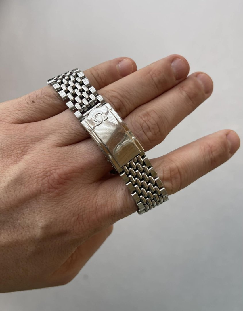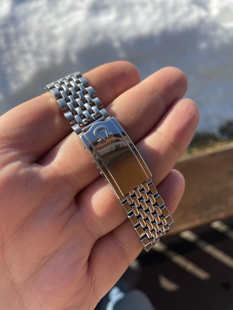Ca. 35/36 mm og med nydelig lenke, som i seg selv skal være verdt noen tusenlapper. Skal passe håndledd opp til 19,5 cm. Jeg har noe mindre håndledd, men har til gjengjeld et par ledd til overs. Veldig pen kasse!