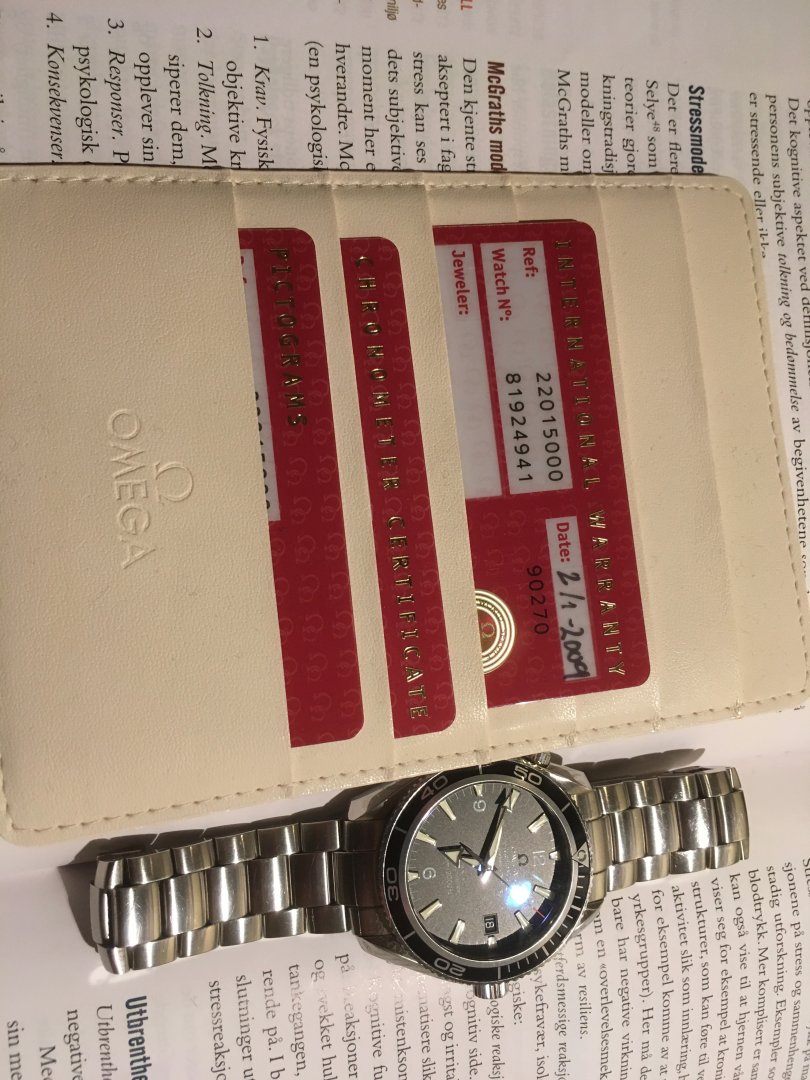 Øvrig informasjon: En meget fin 2009 PO 2500c 42mm ref: 22015000 vurderes solgt. Den er brukt, så det er noen hairlines, men ellers ingen skader. Den var nylig inne på en rep hos Protid i Ski der kronen ble byttet og kvittering medfølger. Boks og papirer medfølger også Det er ikke utført service på uret og det er aldri blitt polert. Jeg legger meg på 24 000,- Spennende bytteforslag vurderes også