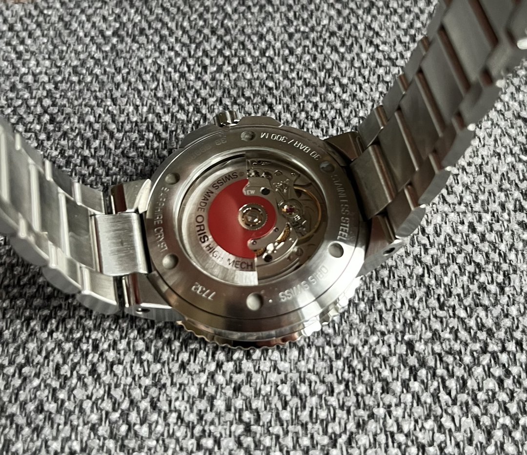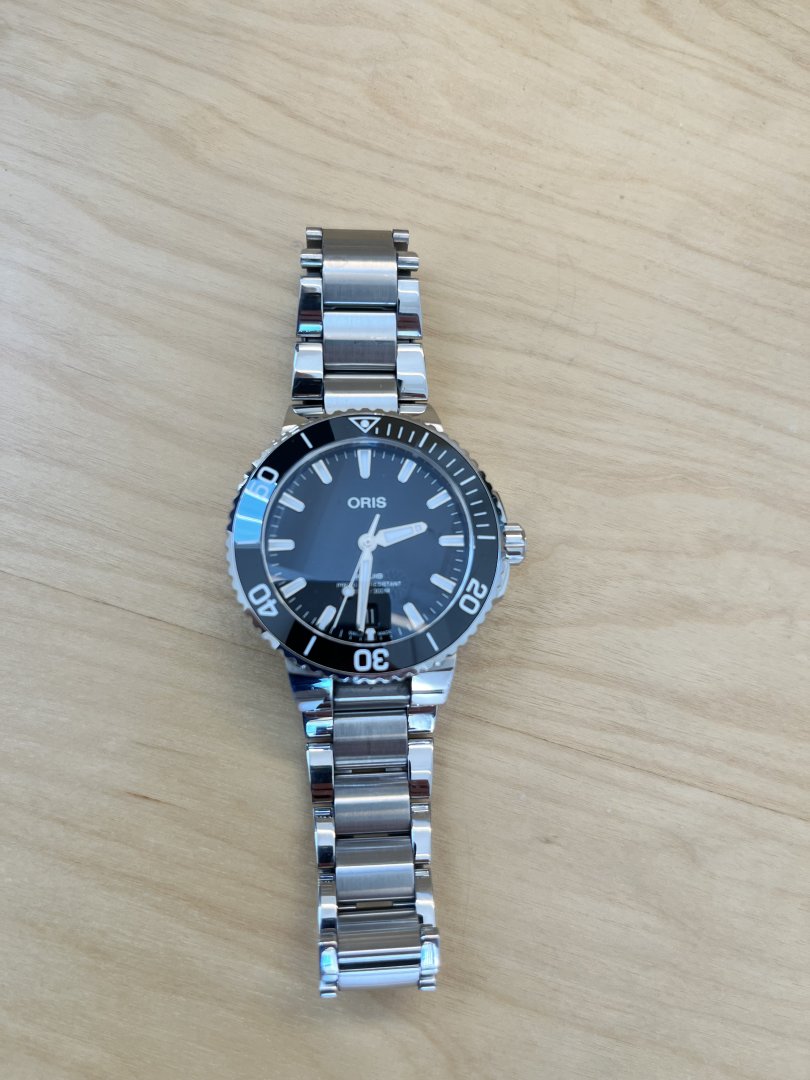 Selger min sorte Oris Aquis på 39,5 mm i diameter. Klokken ble kjøpt hos Urmaker Lian i Trondheim sommeren 2022. Har boks og papirer. Klokken er i veldig god stand, men hairlines og bruksmerker forekommer på lenke og foldelås (se siste bilde). Ingen større riper eller hakk.