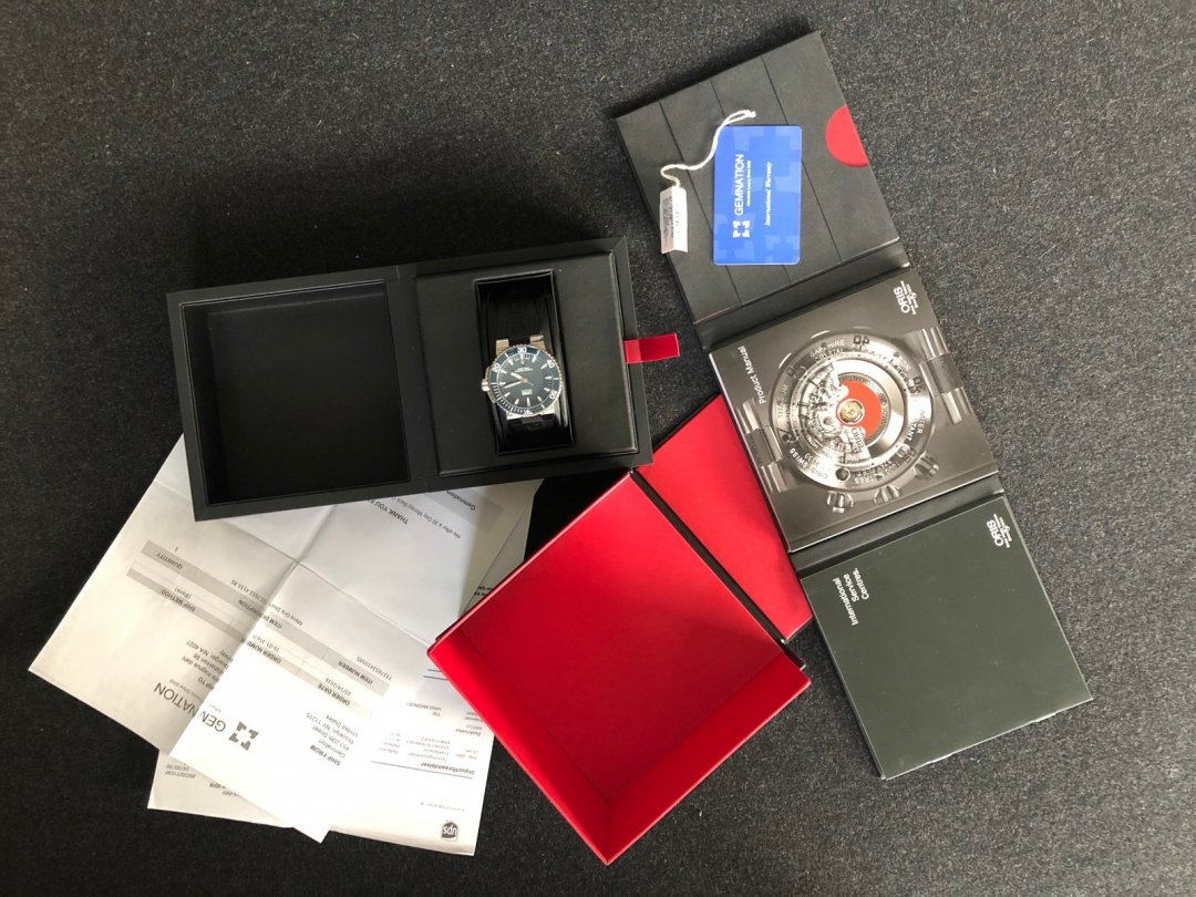 Klokken er kjøpt oktober 2016 fra Gemnation, det foreligger MVA-papirer og ordrebekreftelse/kvittering. Ellers er boksen komplett med tags, bøker Gemnation garantikort. Serienummeret 35-xxxxx daterer klokken til 2015.