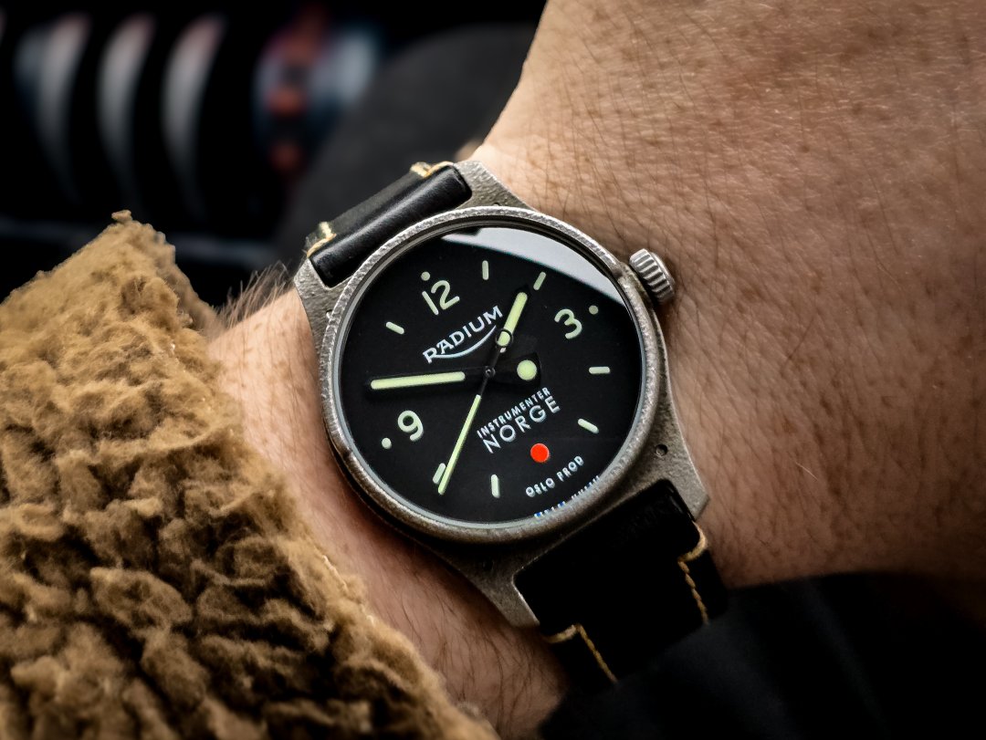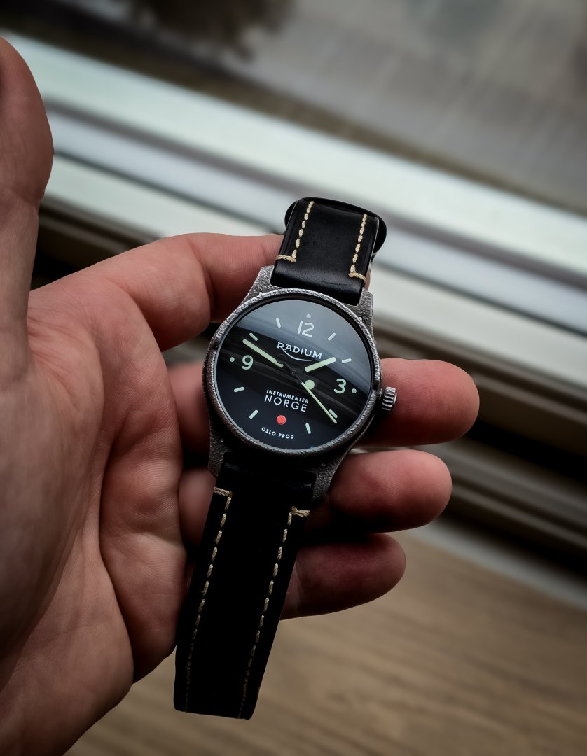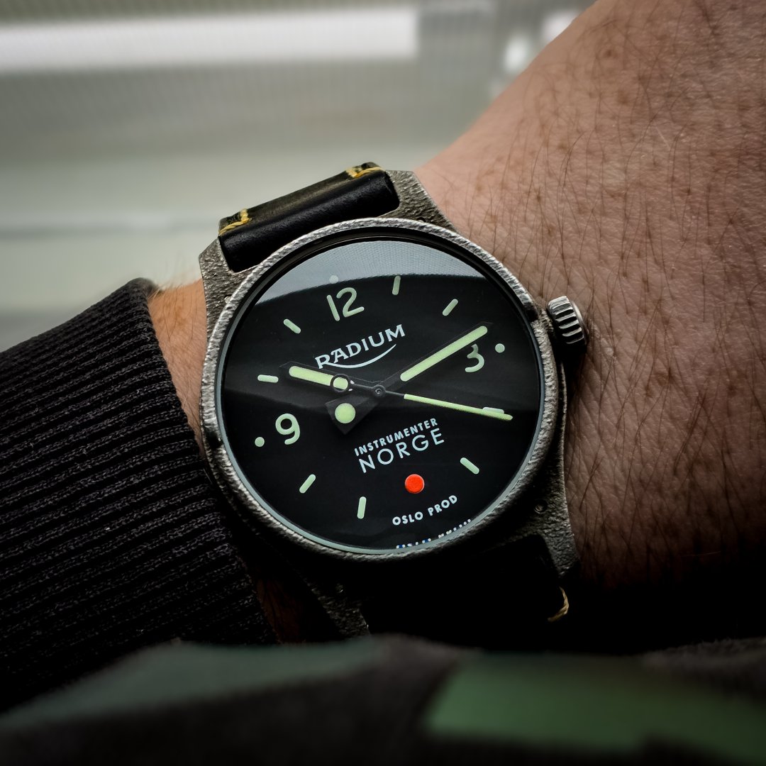 Selger/bytter en meget pent brukt Radium Ikon fra høsten 2024. Medfølger 2 Radium reimer (sort skinn, grønn norgesreim) og en meget behagelig grå natoreim fra Watchgecko.
