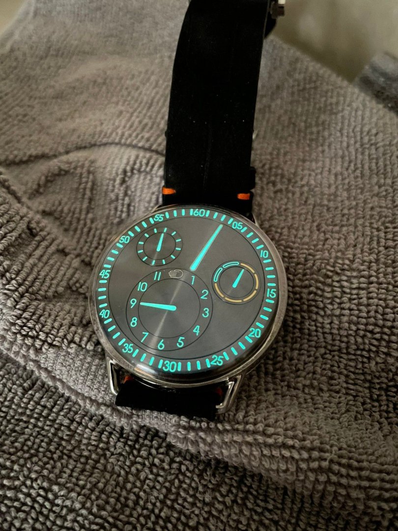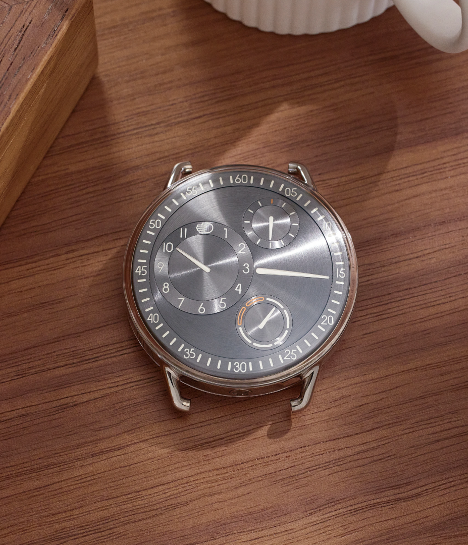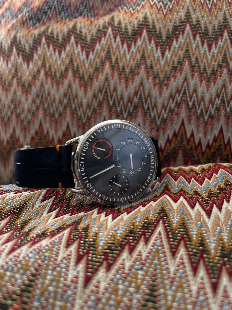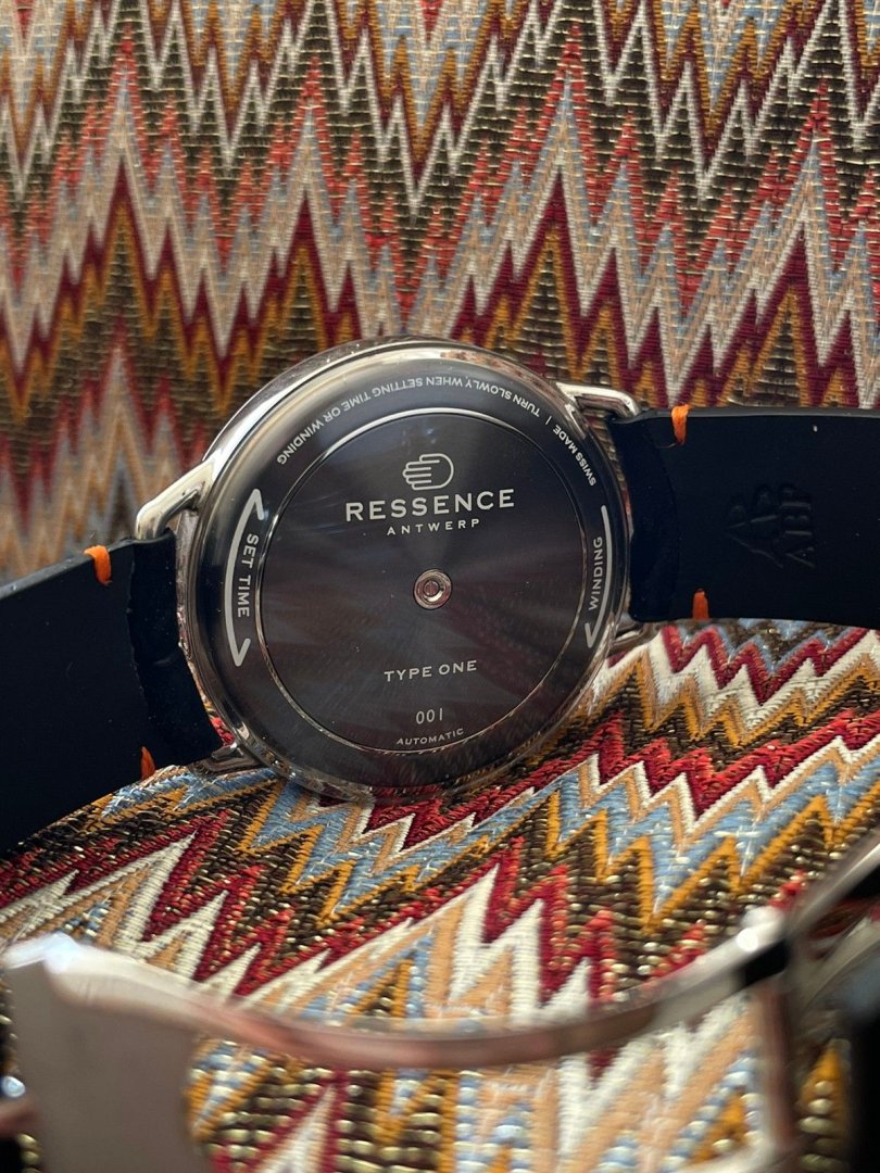 Ressence er et fantastisk merke som ble grunnlagt i 2010 av Benoît Mintiens. De er kjent for sin spesielle måte å vise tid på, da alle sirklene roterer rundt hverandre i løpet av en time. Denne klokken er i polert titanium av grad 5. Den har også safirglass på hele baksiden, samt stort safirglass på fremside. Dette samt mangelen på krone gjør at den bærer mindre enn sine 42mm. Klokken stilles ved å dreie på baklokket. Verket er en 100% mekanisk modul med ca 40t gangreserve. Type 1 ble lansert på Baselworld i 2014 og er idag ikke lenger i kolleksjonen. Samlepiece for dem som samler på microbrands! Det som gjør denne klokken enda mer spesielt er at dette er nummer 001 og ble brukt som en demo av klokken på alle de store messene i starten! Denne antas da å være fra 2013-2014. Klokken har en fantastisk skive som er sunburst grå med et rått spill i sola!