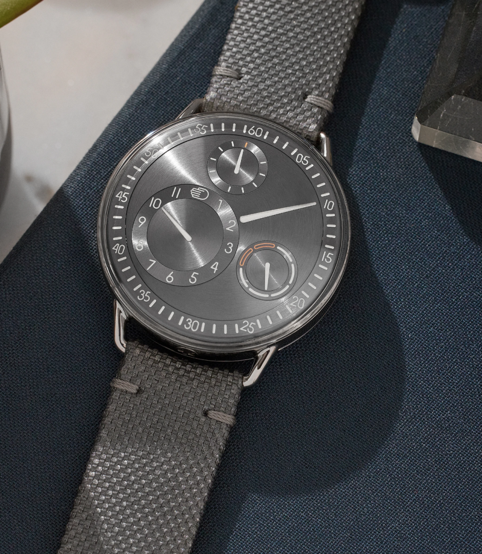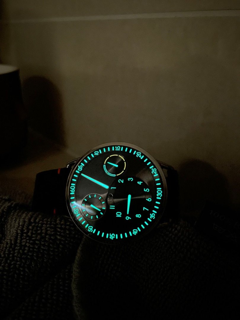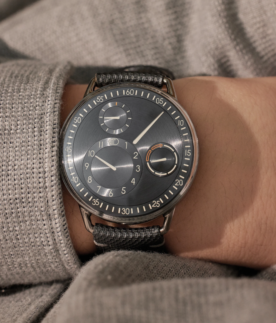 Ressence er et fantastisk merke som ble grunnlagt i 2010 av Benoît Mintiens. De er kjent for sin spesielle måte å vise tid på, da alle sirklene roterer rundt hverandre i løpet av en time. Denne klokken er i polert titanium av grad 5. Den har også safirglass på hele baksiden, samt stort safirglass på fremside. Dette samt mangelen på krone gjør at den bærer mindre enn sine 42mm. Klokken stilles ved å dreie på baklokket. Verket er en 100% mekanisk modul med ca 40t gangreserve. Type 1 ble lansert på Baselworld i 2014 og er idag ikke lenger i kolleksjonen. Samlepiece for dem som samler på microbrands! Det som gjør denne klokken enda mer spesielt er at dette er nummer 001 og ble brukt som en demo av klokken på alle de store messene i starten! Denne antas da å være fra 2013-2014. Klokken har en fantastisk skive som er sunburst grå med et rått spill i sola!