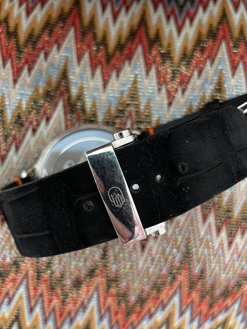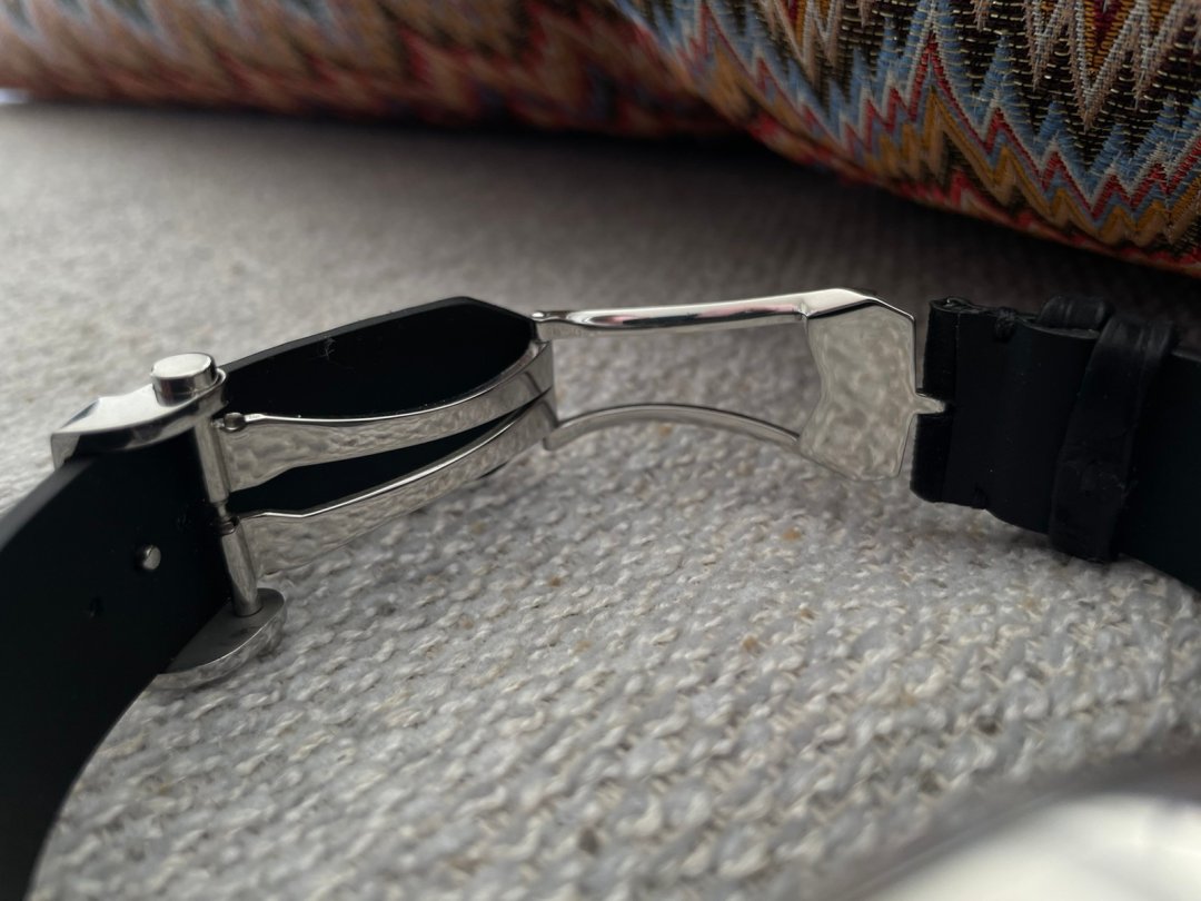Medfølger 3 custom remmer fra ABP Paris til en samlet pris på nesten 15.000kr! *Sort alligator med oransje søm *grå flodhest med oransje søm og gummiert bakside *brun elefant med off-white søm og oransje-farget kork på baksiden. Alle disse kan brukes med den originale foldespennen.