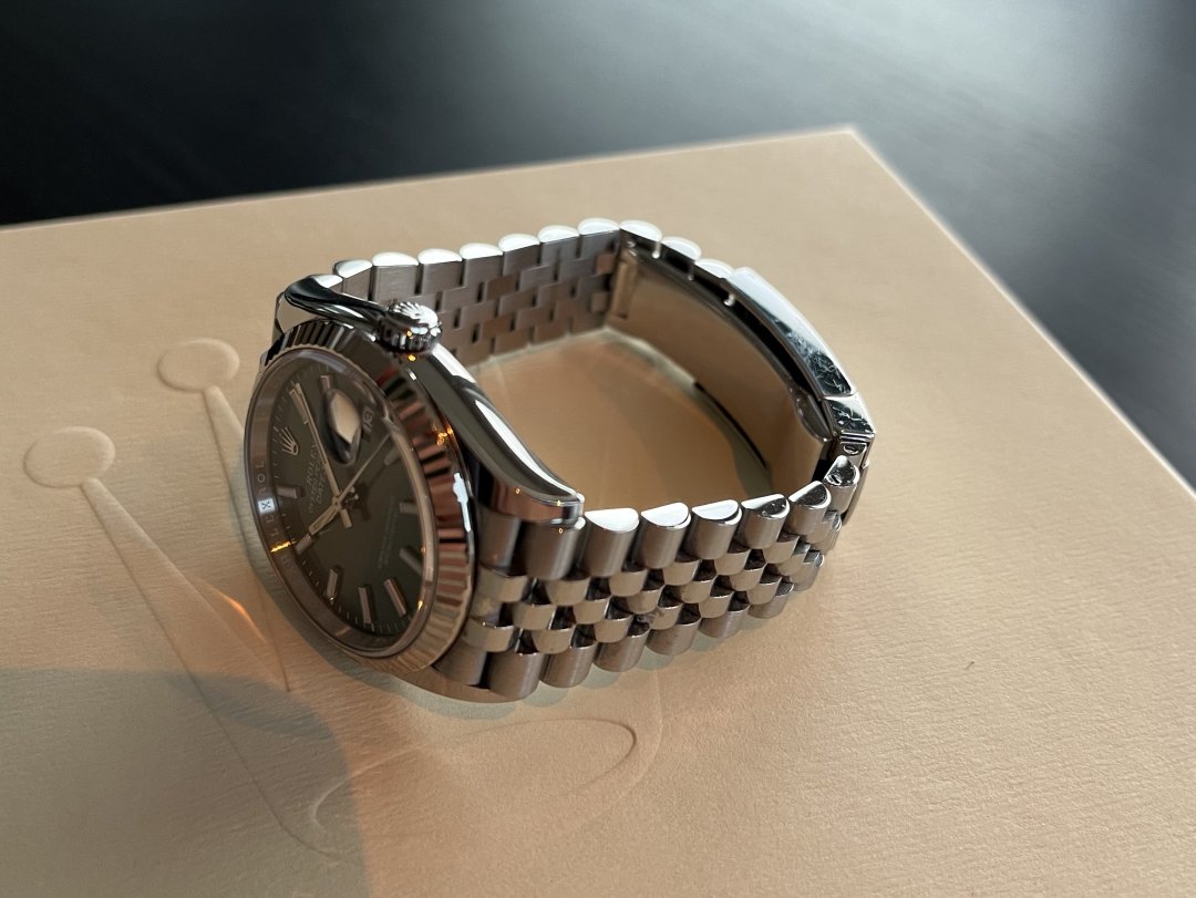 Selger en råflott eksemplar av en Rolex Datejust 126234 mint grønn skive med fluted bezel og jubilé. Årsmodell 2022.