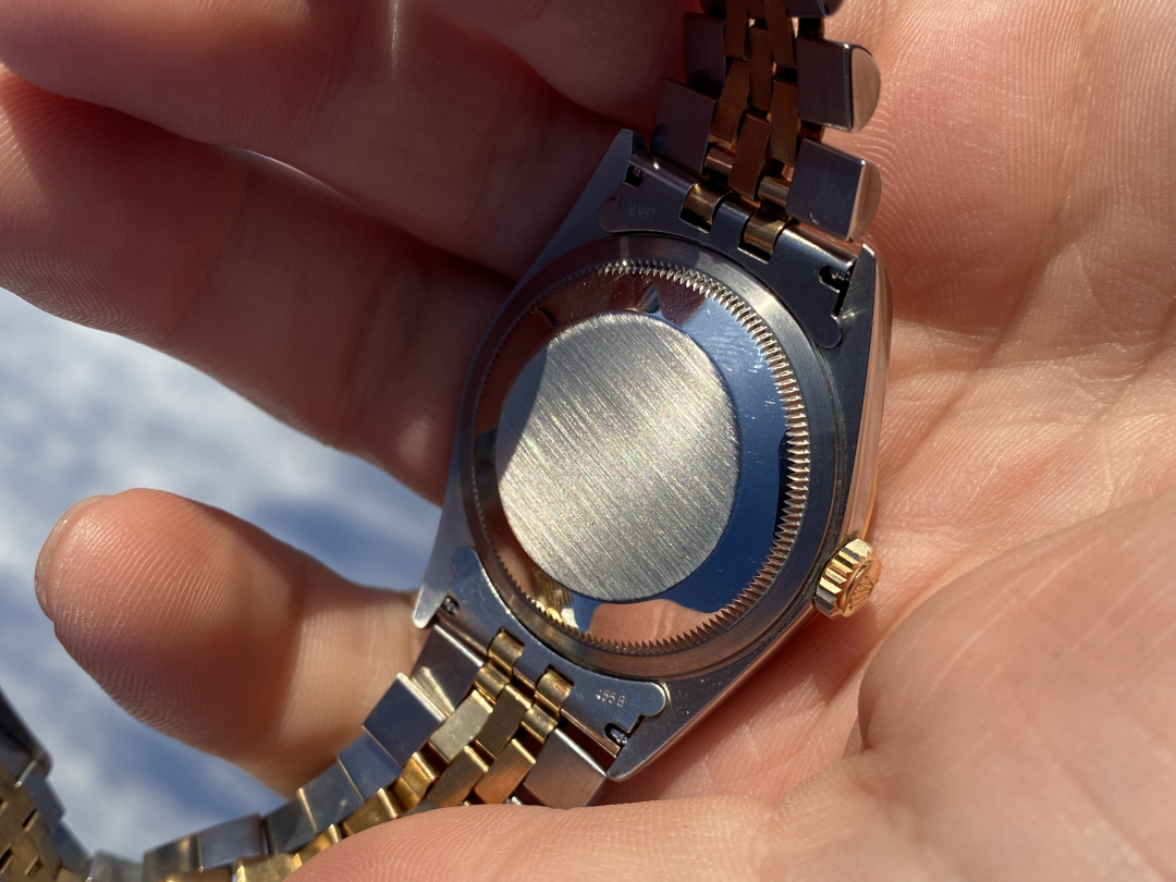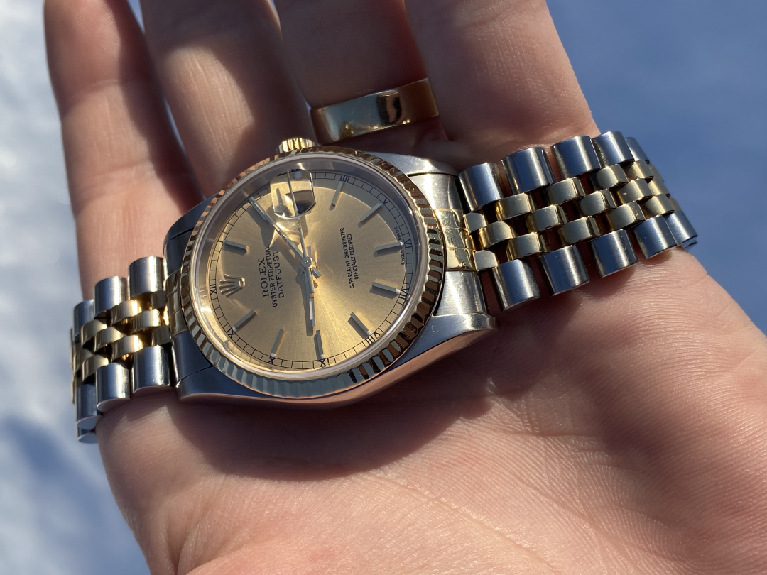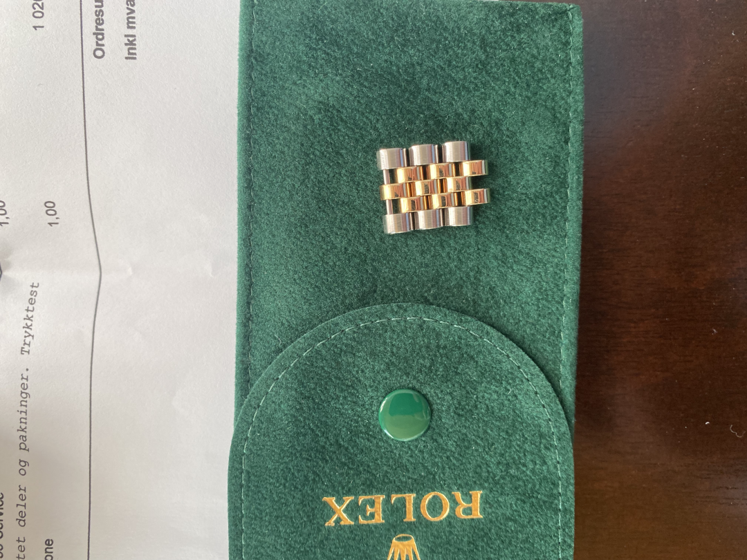 Denne modellen er fra 2001 og har holdt seg godt. Skiven er fantastisk å se på og two-tone gir klokken en fantastisk sjarm på armen. Med sine 36mm fungerer den fint for både menn og kvinner. Klokken selges som den er, og både bildene og teksten er en del av annonsen. Da klokken er fra 2001 må det regnes med hairlines og lignende, men jeg oppfatter klokken som meget pen. Det er dog noen merker i glasset ved klokken elleve og tolv. Dette er det tatt hensyn til ved prissettingen. Det følger med original lenke til klokken, en utrolig behagelig Jubileelenke. Det følger videre med diverse servicedokumenter og boks og ytterboks, men sertifikatet ol har blitt dessverre blitt borte med tiden. Sender også med service-pouch hvis det er interessant.
