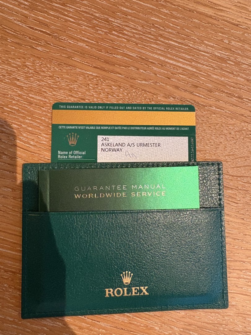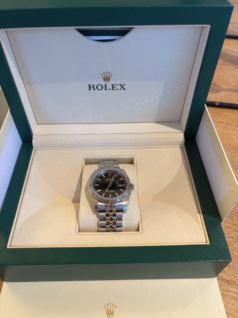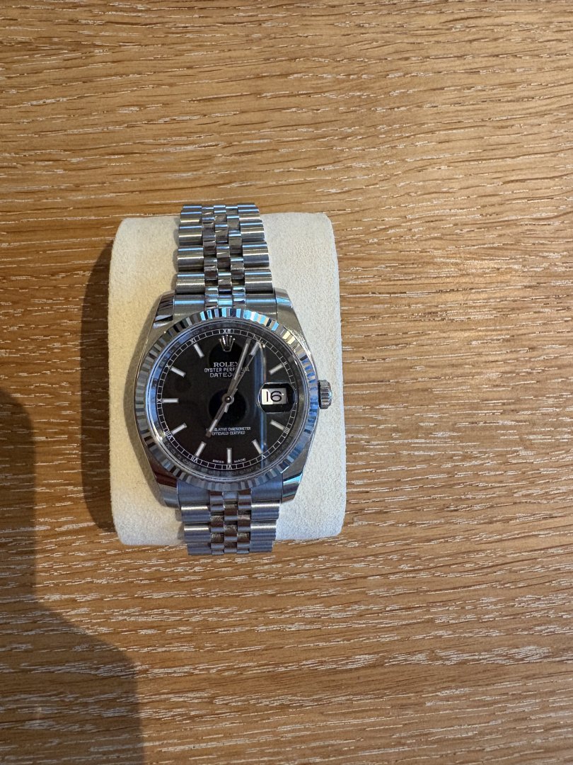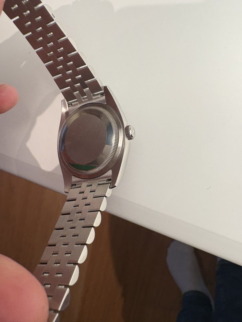 Veldig pent brukt Rolex datejust 36 med sort (og lakserosa) skive selges. Klokken ble kjøpt i juni 2019 hos urmaker Askeladd og har kun hatt én eier. Klokken er brukt svært sparsommelig i rotasjon med flere klokker og fremstår henimot ubrukt. Klokken ble levert med rosa skive, men urmaker byttet til sort, original urskive etter 6 mnd av estetiske årsaker. begge urskiver medfølger. Ellers følger alt av nødvendig dokumentasjon med. Kan overleveres på Sørlandet, kanskje i Oslo om ting klaffer.