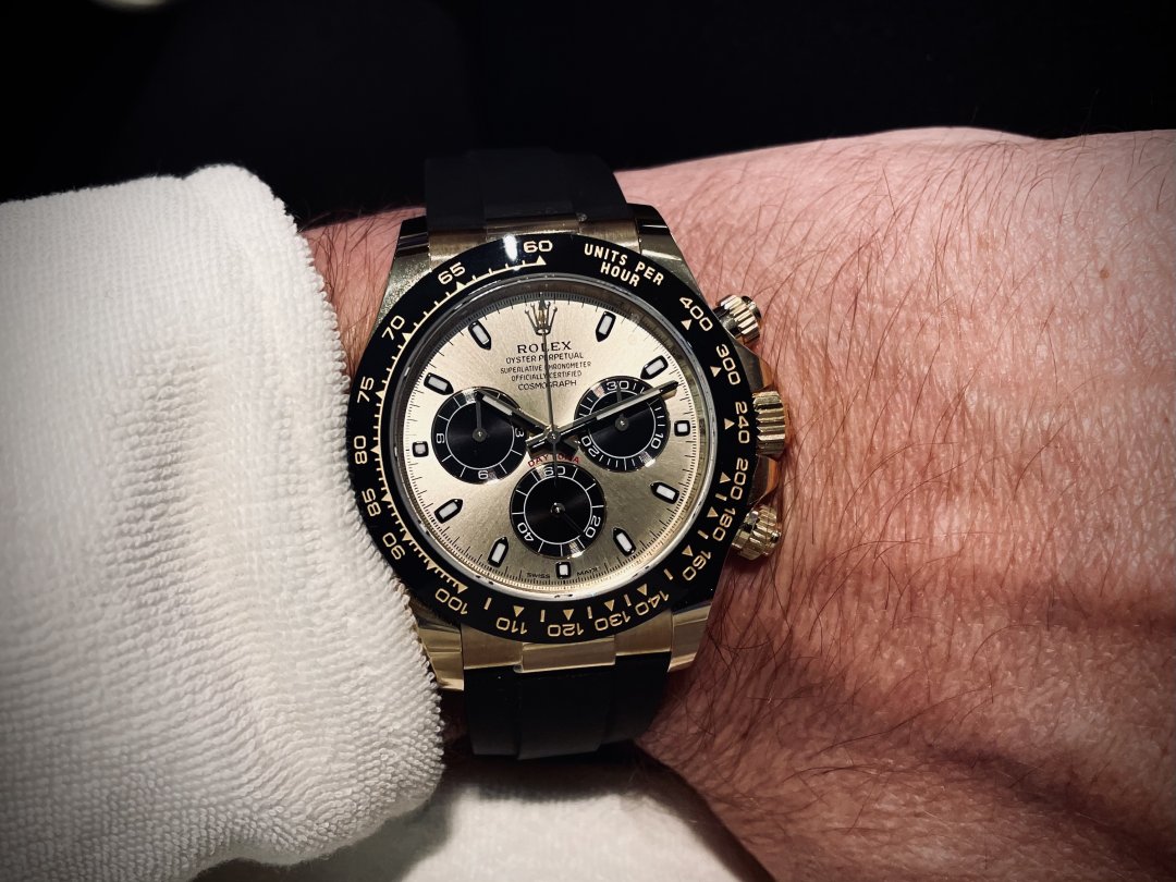 Jeg ser at det i april i år kom ny skive til rosé daytonaene; «sundust». Denne tok over for «pink». Har ikke funnet gode bilder av denne, og lurer på om noen har sett den IRL eller gode bilder av den? Skal visstnok være en del lysere enn den gamle og ikke så rosa. Fant et fint bilde av den nye med baguetter, men ikke funnet tilsvarende bilde av den «alminnelige» versjonen uten diamanter og med sorte subdials.