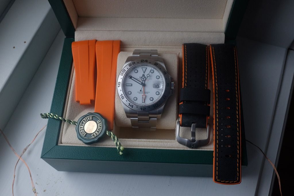 For salg eller bytte luftes en svært pen Polar, opprinnelig kjøpt hos Askeland januar 2016. Denne kom inn i en byttehandel for litt siden, men ettersom den oppleves litt i største laget for mine håndledd velger jeg å la den gå videre. Klokken kommer komplett med bokser, sertifikat, grønn tag og ekstra lenkeledd. Med i handelen følger også en oransje Rubber B og en svært behagelig Hirsch Robby. Klokken bærer preg av svært pent bruk. Dette er vel en modell som er godt kjent for de fleste, men kan trekke frem kraftig lume og svært god lesbarhet som spesielt markante egenskaper. Den har en nydelig skive og vakre oransje detaljer, som GMT-viseren med hint til tidligere generasjoner av denne klassikeren.