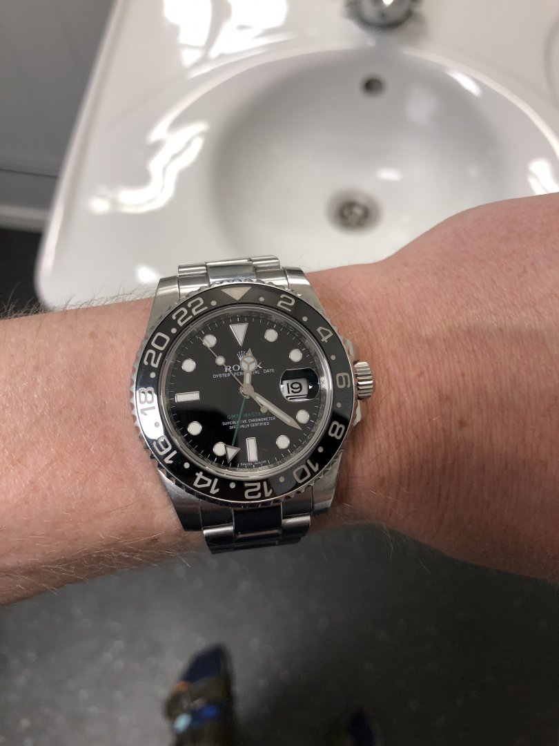 Merke, modell og år: Rolex GMT master II, 116710LN, 2008