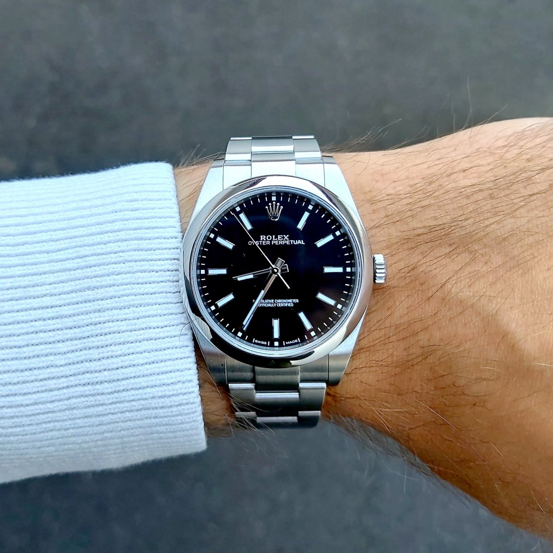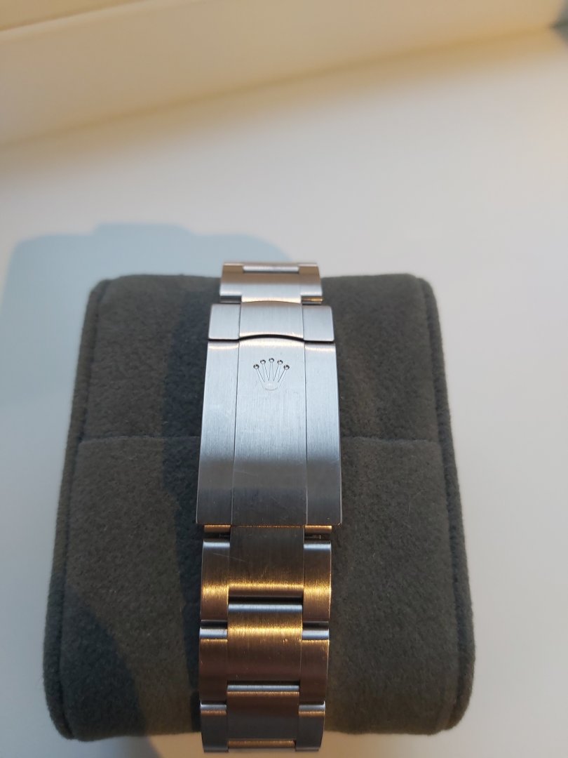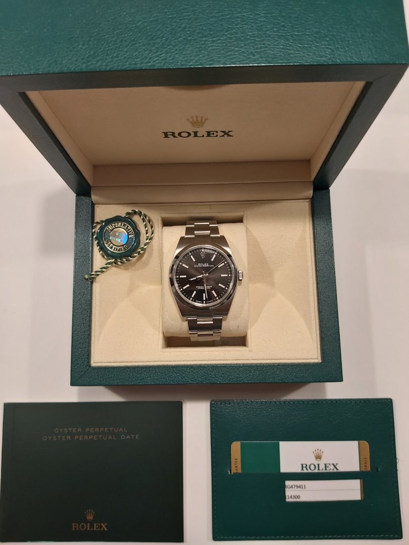 Lufter en komplett Rolex Oyster perpetual 39mm (114300) med sort skive for salg. Klokken er fra 2018 og er kjøpt hos Askeland. Den er i fin stand, men har normale bruksmerker og hairlines.