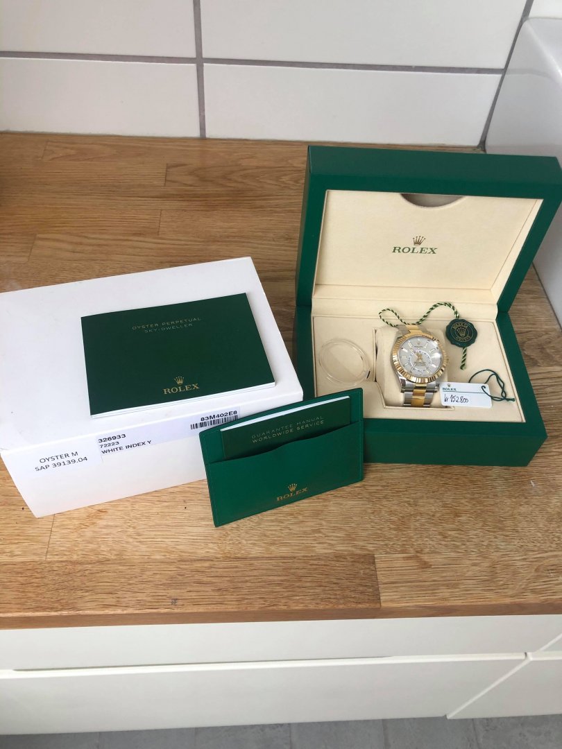 Vurderer salg av min Rolex Sky-Dweller (326933) med Hvit skive. Klokken er kjøpt 5. mars 2018 hos norsk AD.