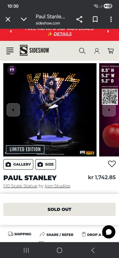 Jeg betalte 163 euro for denne. Var heldig å finne et eksemplar på et rockemuseum i Barcelona. Jeg betalte butikkpris hos Sideshow før den ble utsolgt ( ca 1900kr)